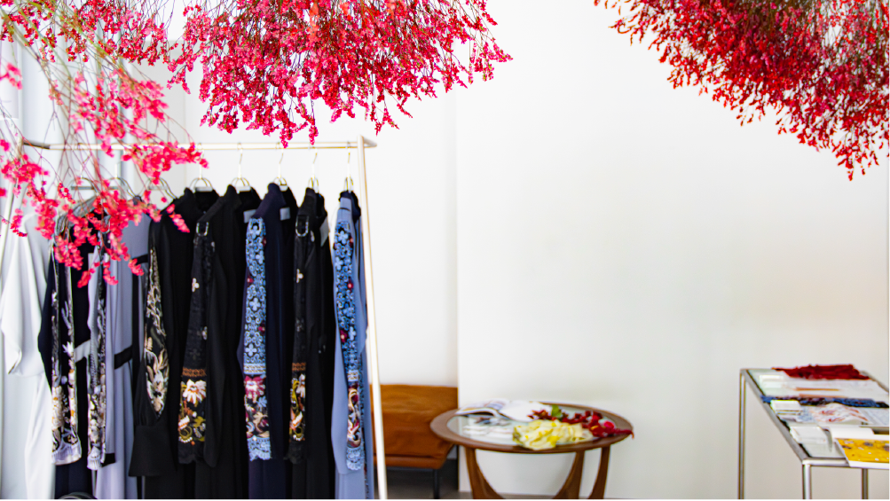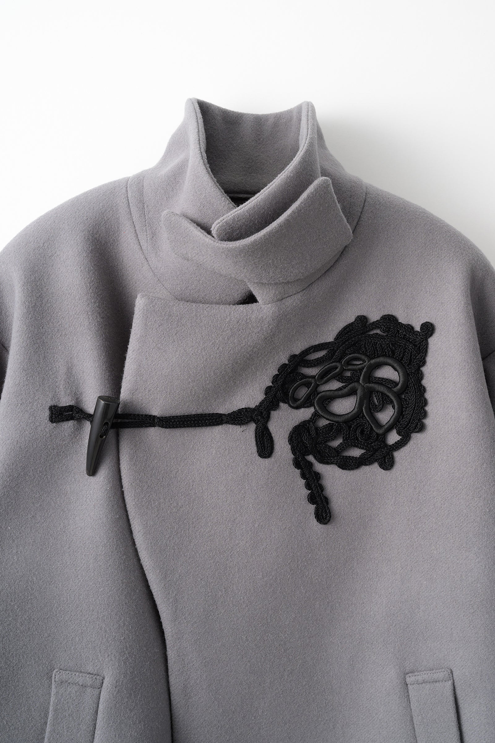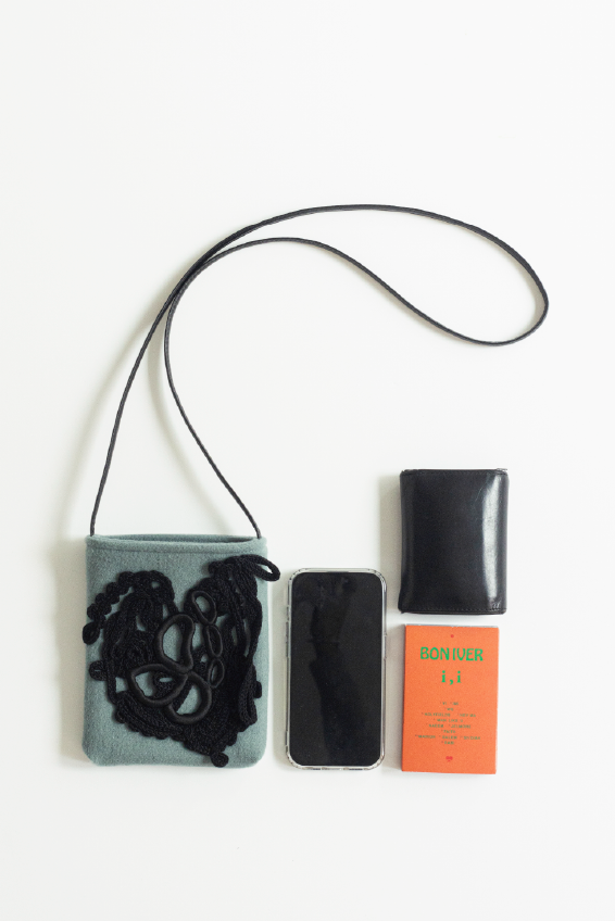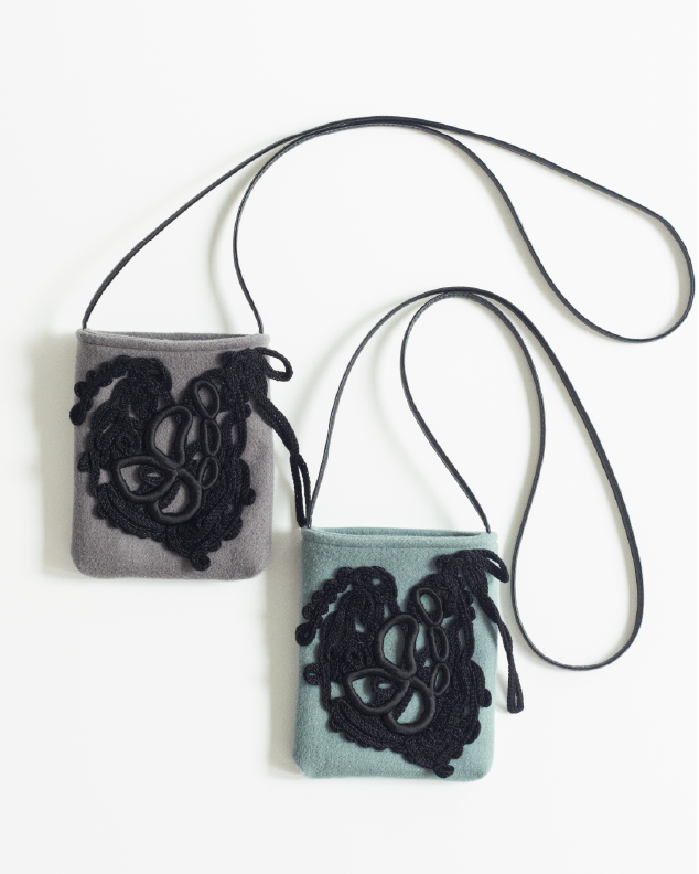 「Trillium embroidered wool coat」 に採用された、ウール生地に刺繍モチーフを施したオリジナルポーチバッグ。