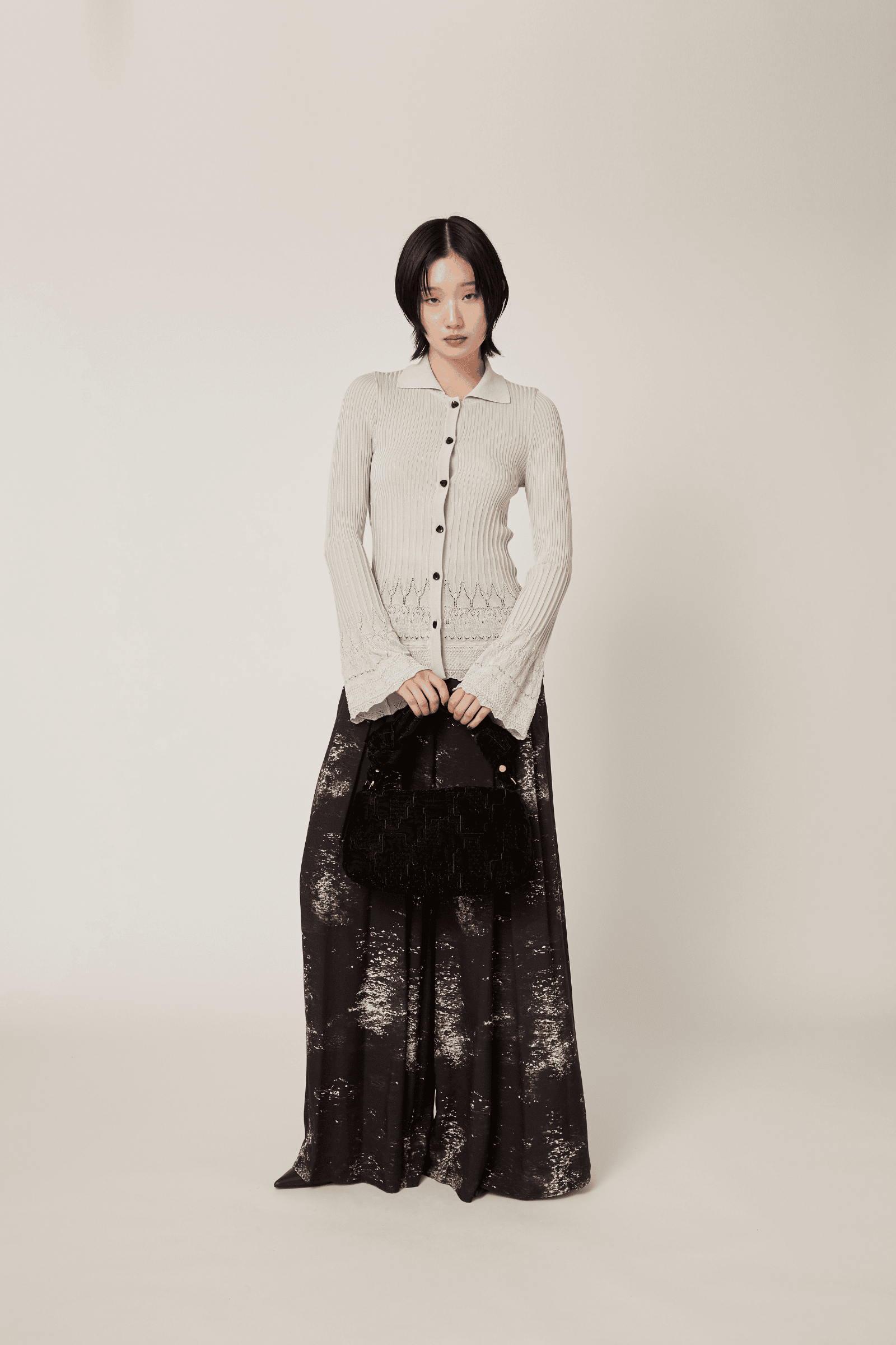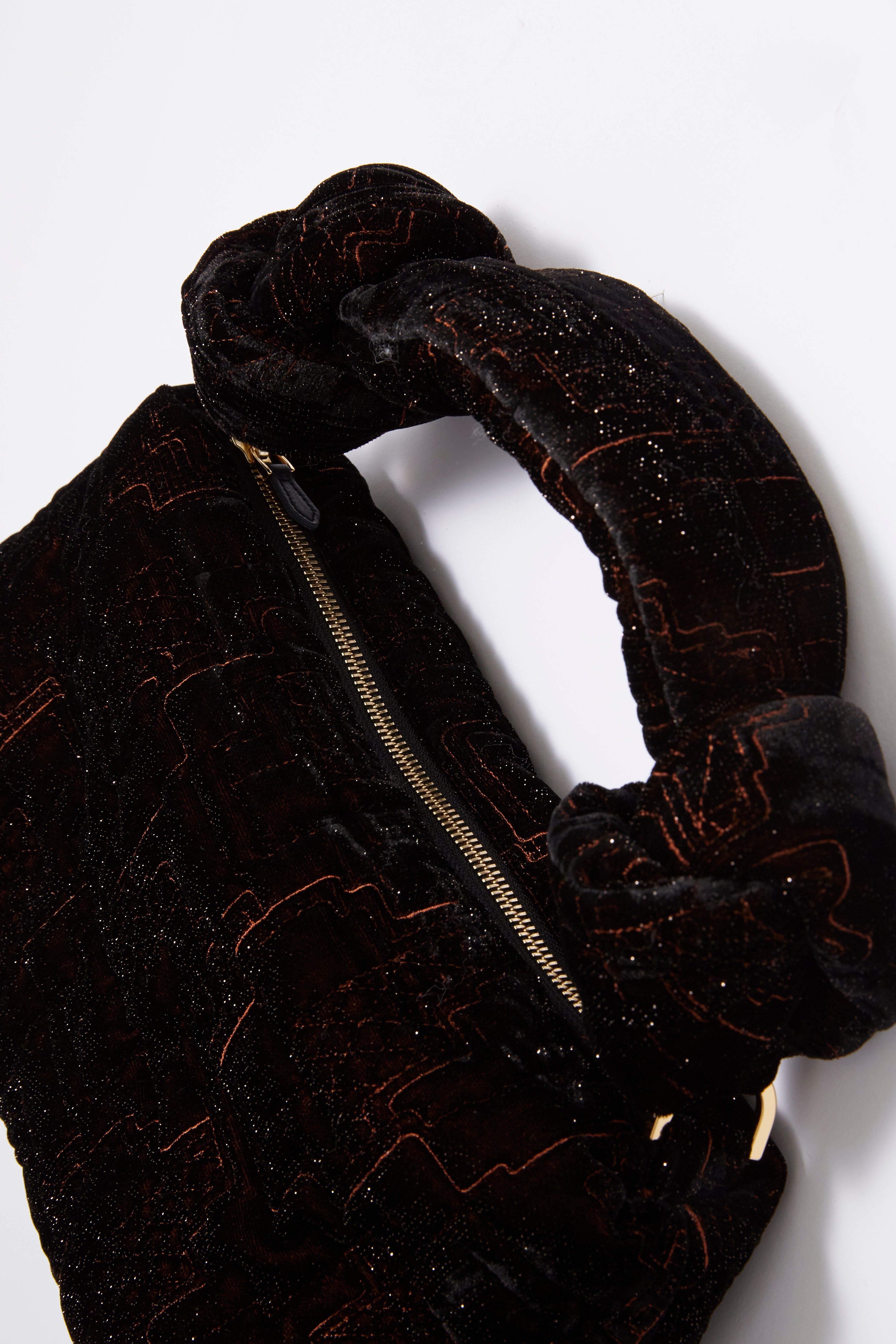 土台生地にはラメ糸を織り込み毛足部分との染め分けをしシャンブレーのような表情の奥行きを生み出したオリジナルのベロア生地を使用。シンボリックな柄は夜景に浮かぶ街の情景をイメージ。複雑な柄かつキルト刺繍特有の柄ズレを起こさぬようにデータ作成が何度も試行され生み出された唯一無二のテキスタイル。