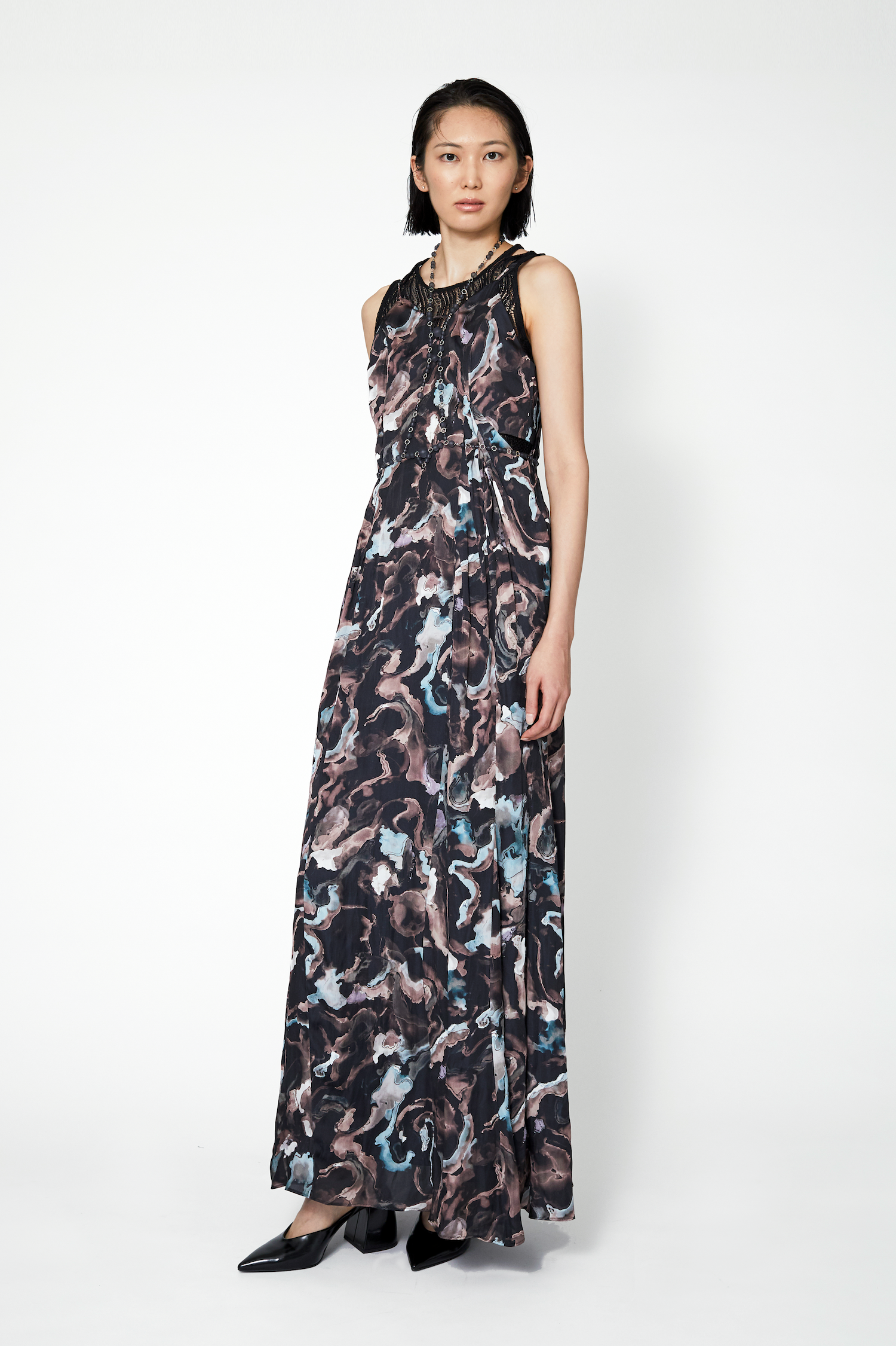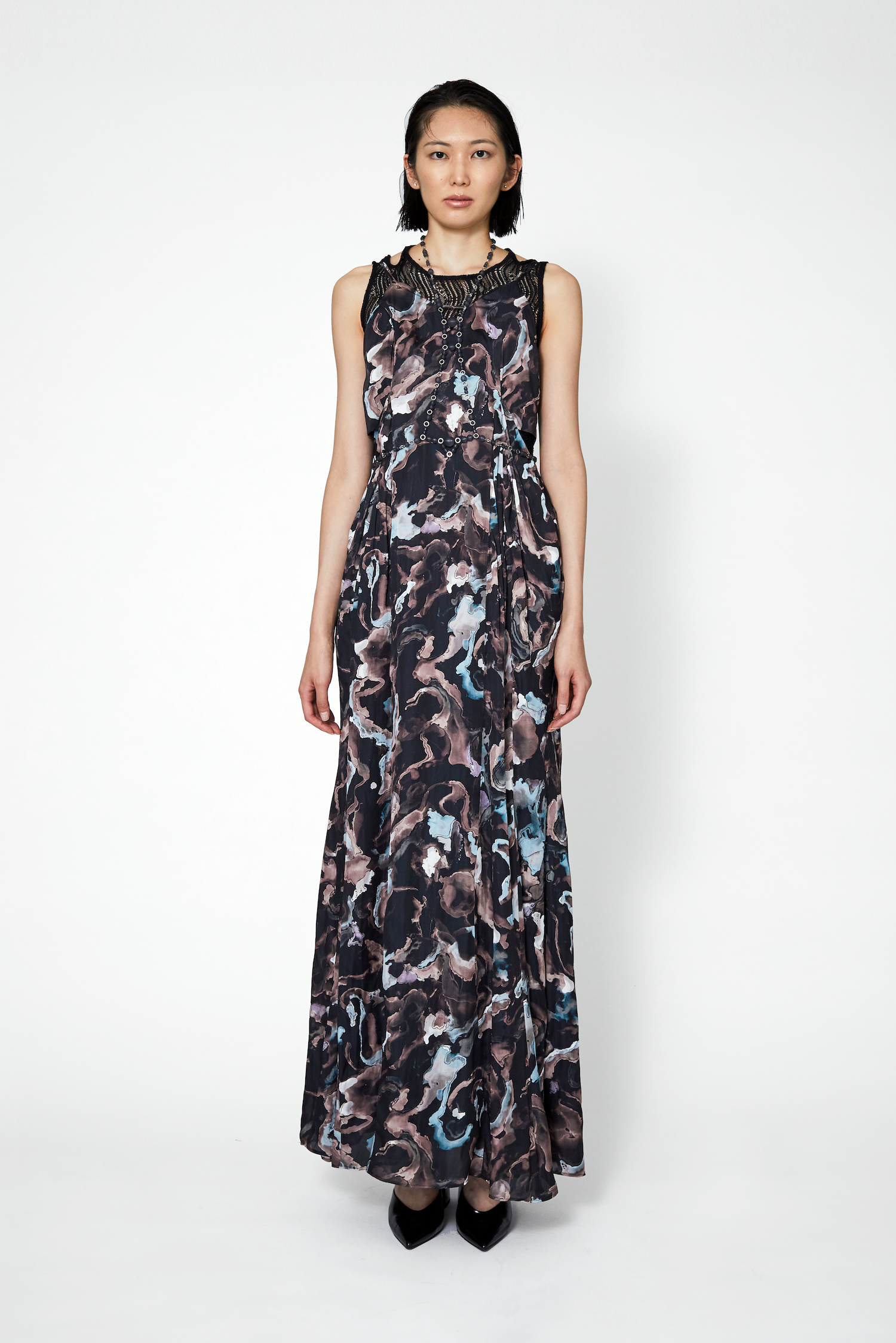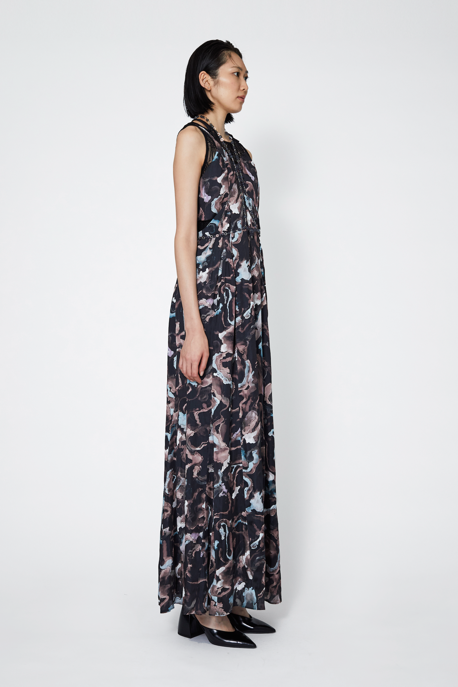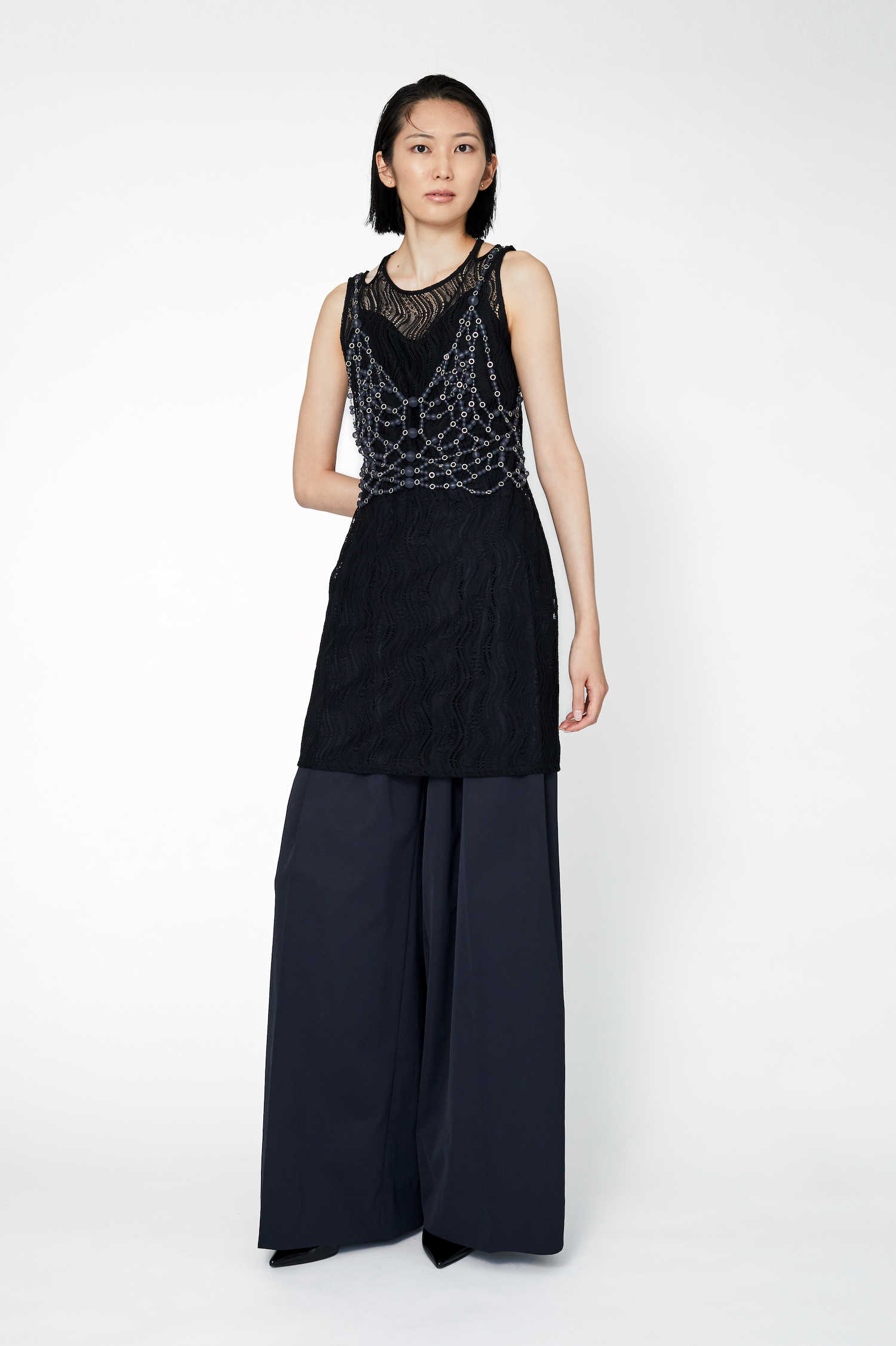 オリジナルカラーで染め上げたストレッチレースを使用したスリーブレストップス。ミニマルなデザインでありながら、首元の抜け感を出すことで、上品で高級感のある仕上がりに。やや長めに仕上げた着丈により、様々なスタイリングのアレンジが可能な1着。