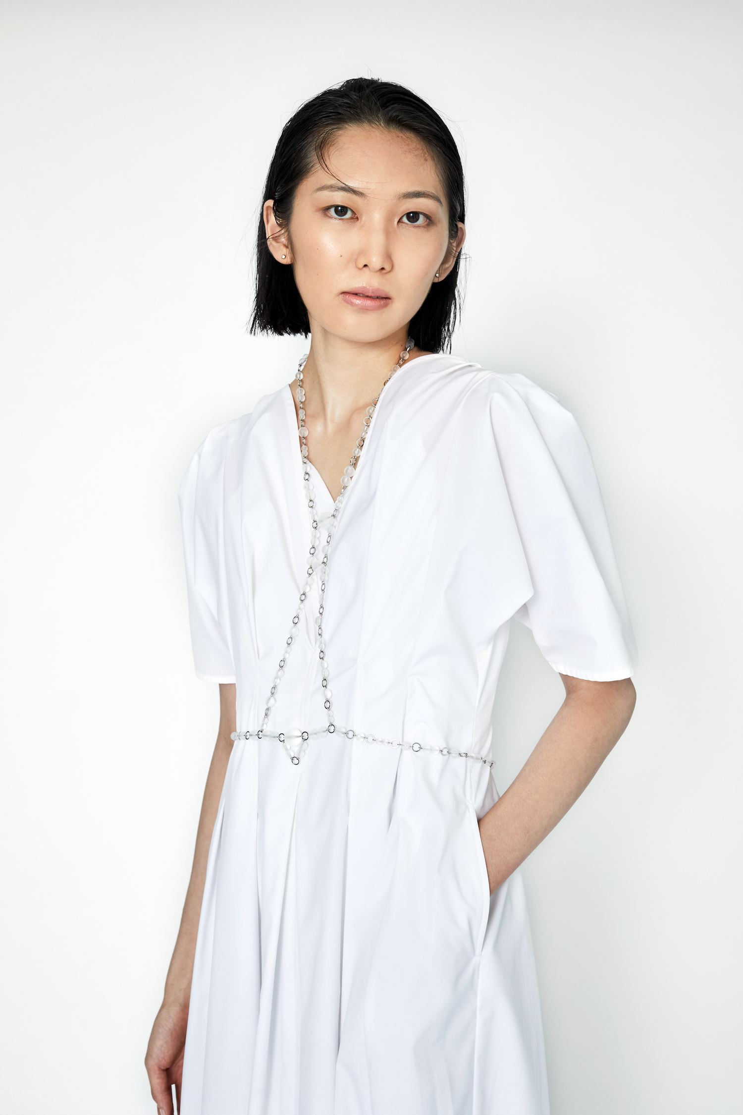 種の無垢な佇まいを、モノトーンのカラーリングとフォルムで表現したドレス。紫外線防止・シワ防止・接触冷感・マシーンウォッシャブル対応。