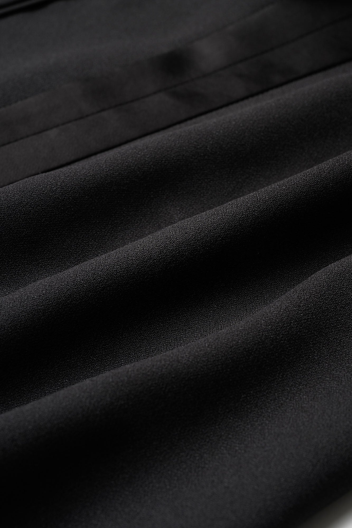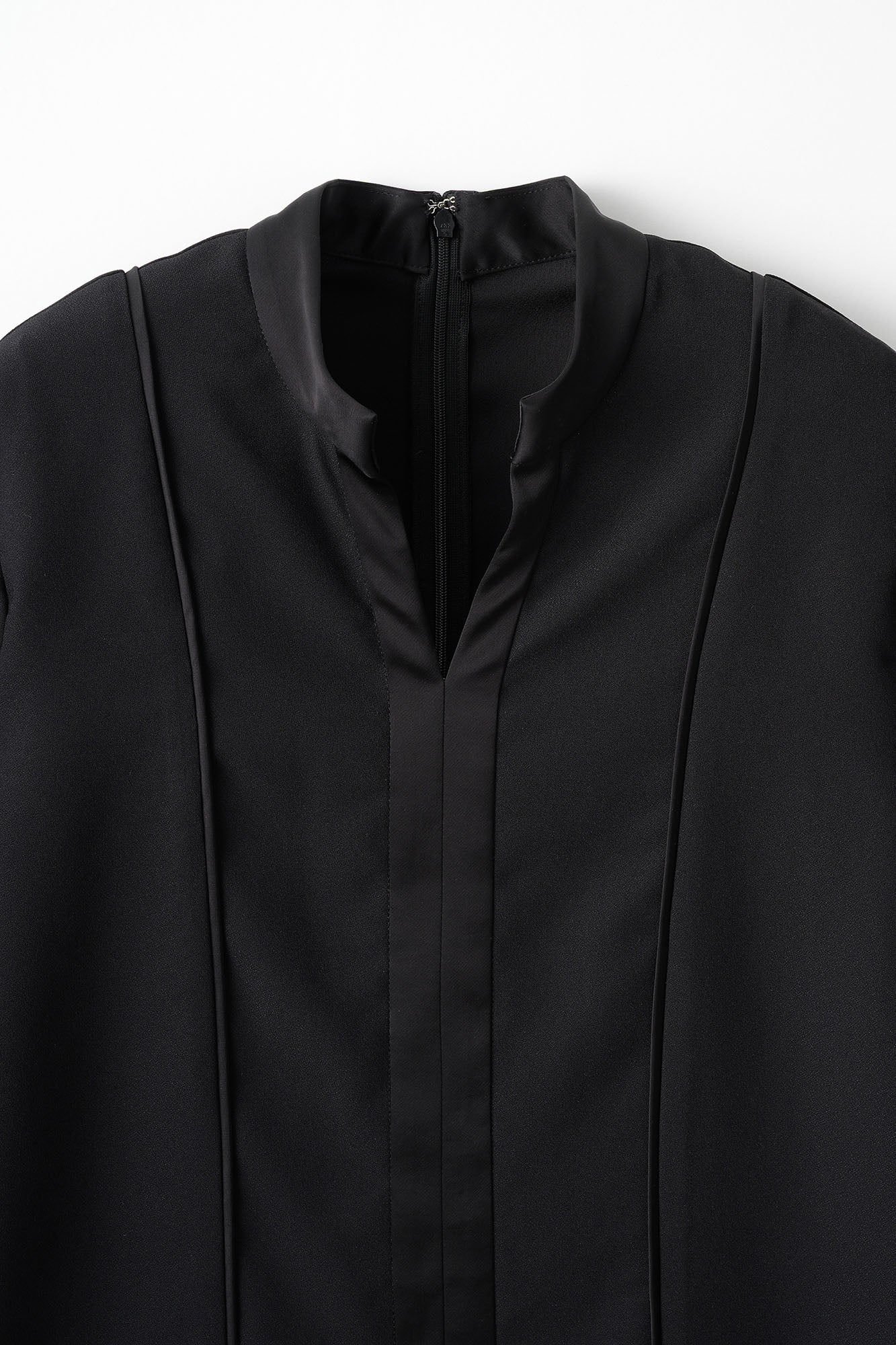 ダブルフェイスのサテンは生地の落ち感と共に立体感のあるシルエットを可能とする。