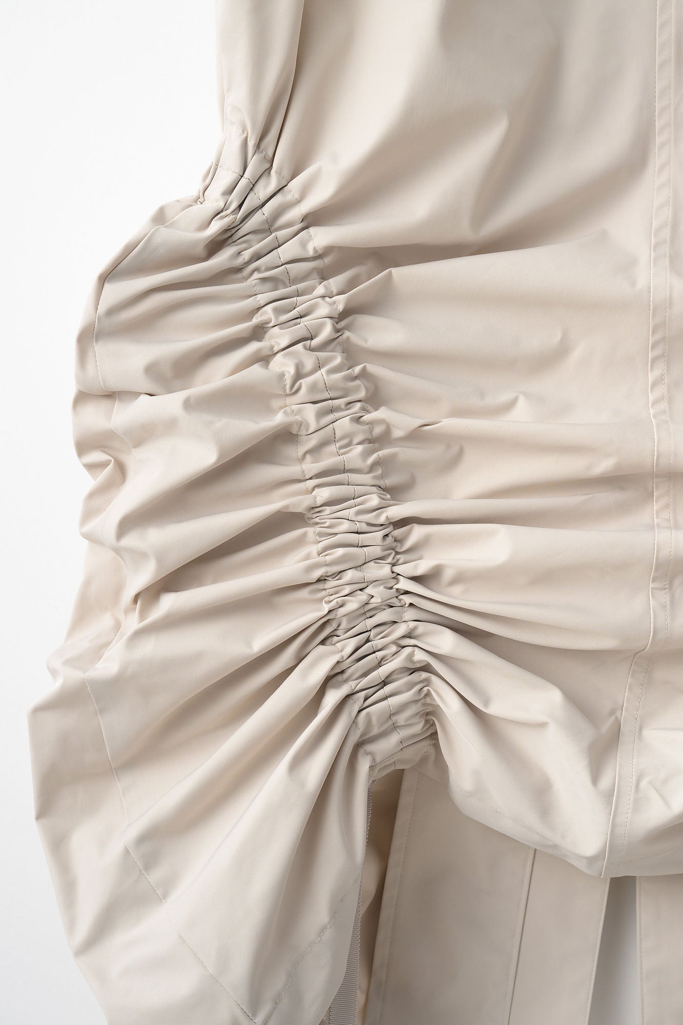 身頃やポケット部分に施された紐のディティールでシルエットや着丈の変化を楽しめる。
