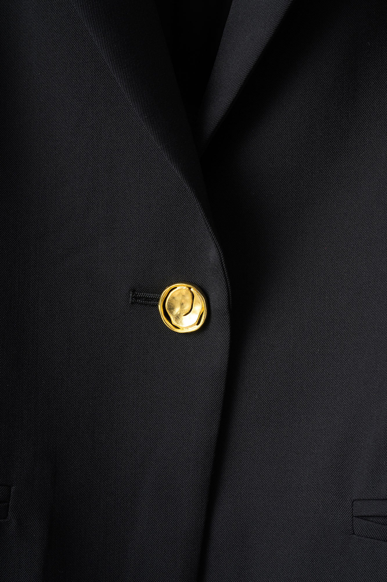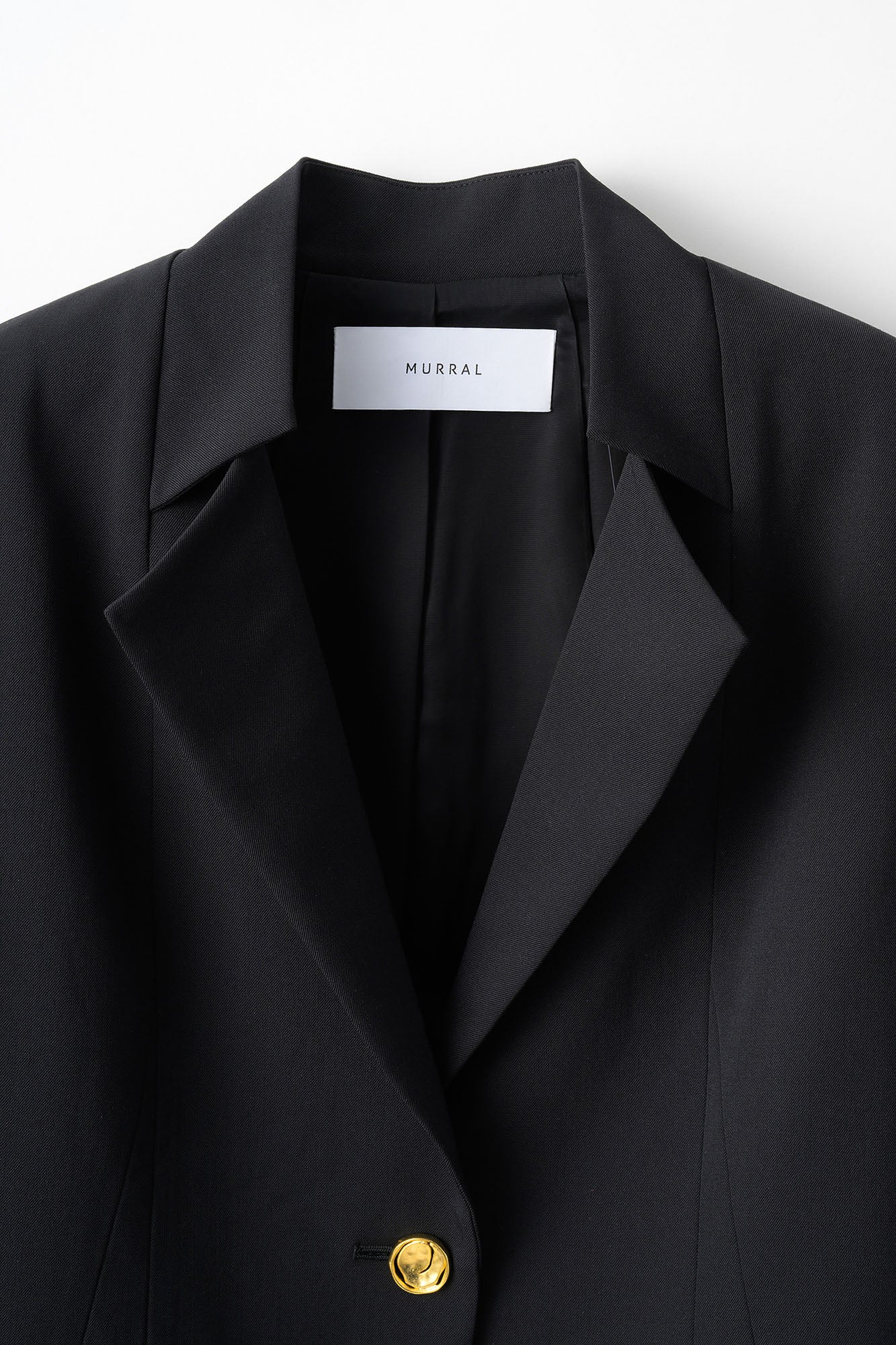素材にはハリコシのあるウールギャバを使用し、欠けたようなモチーフのオリジナル釦が全体のアクセントに。