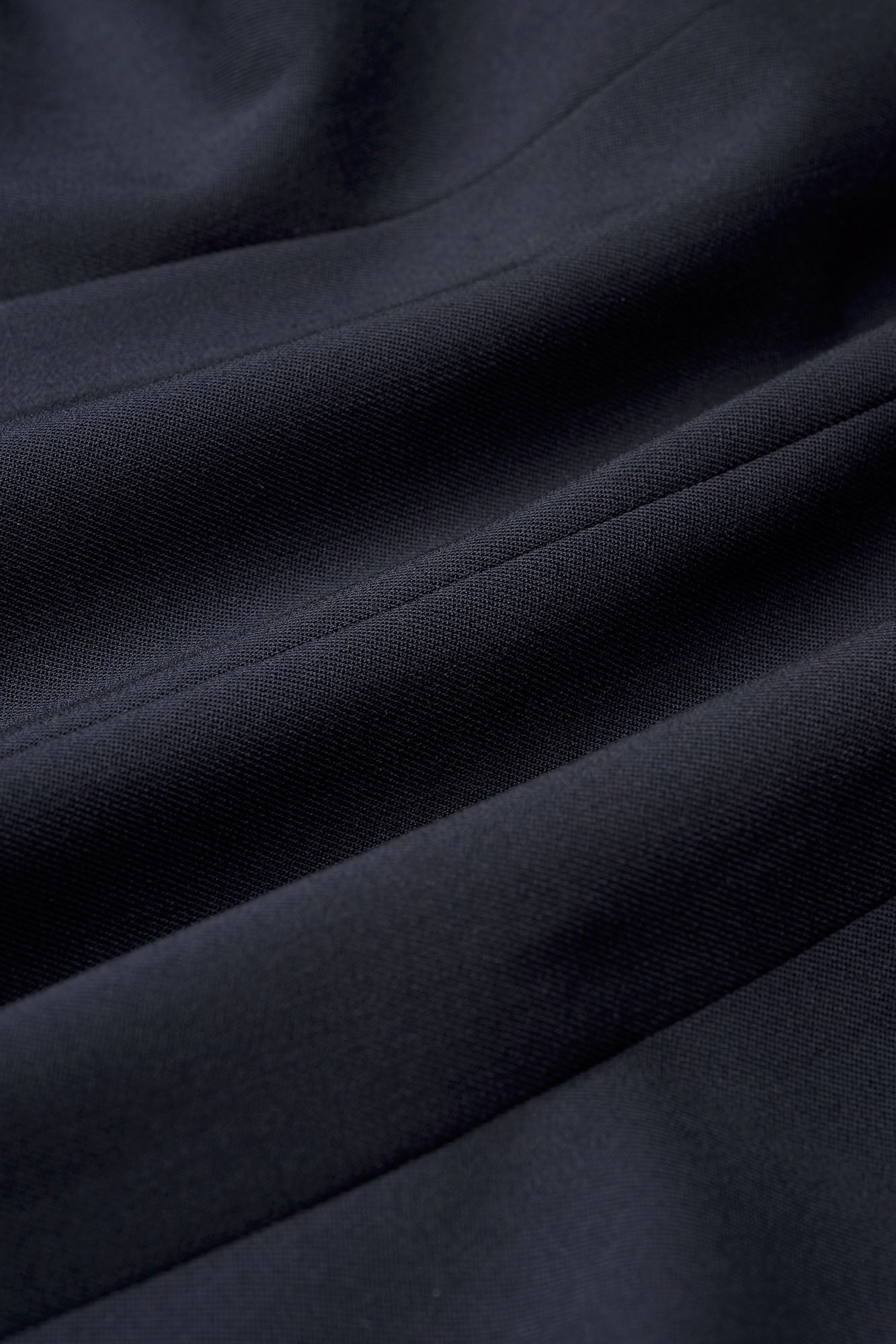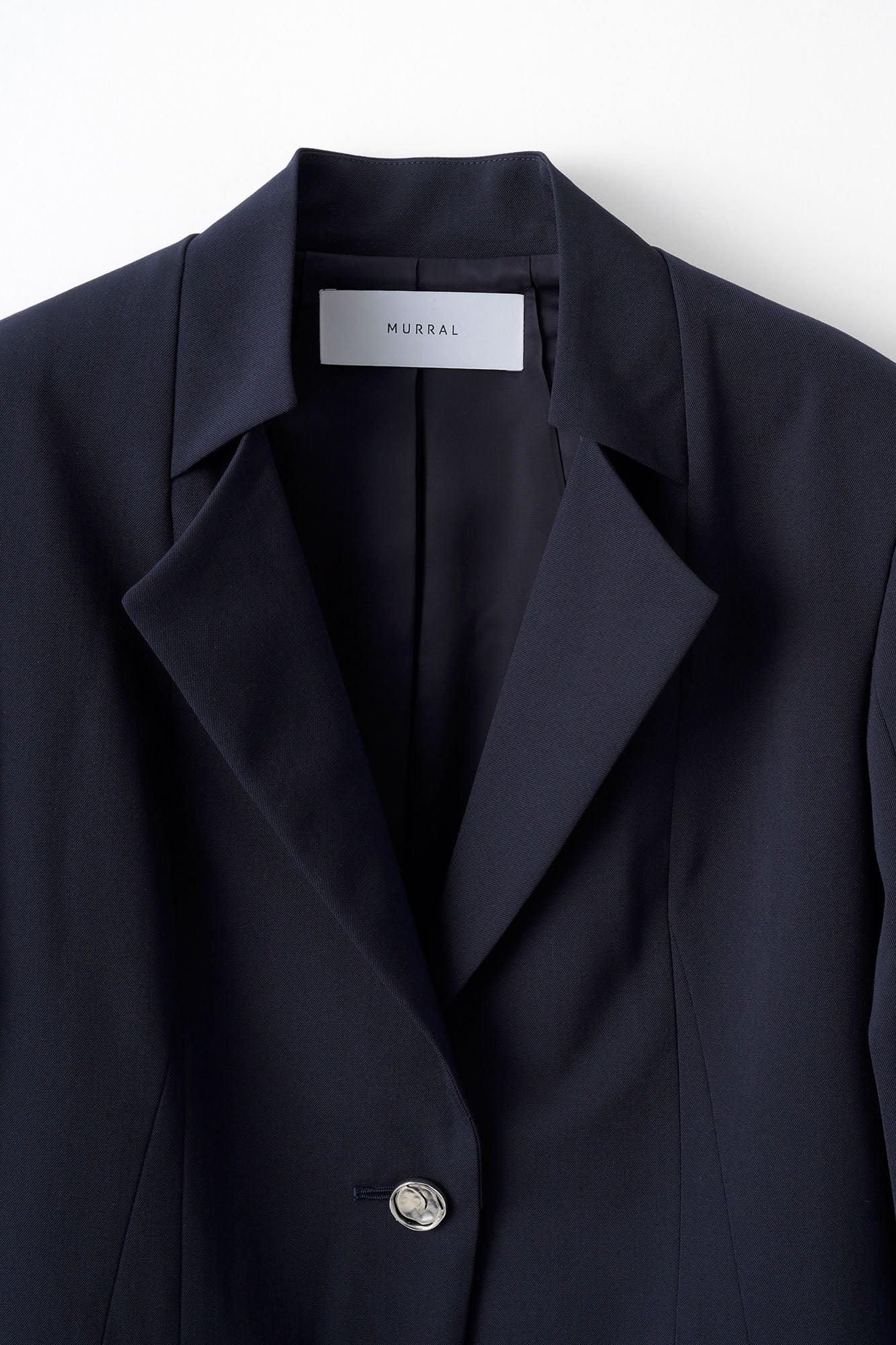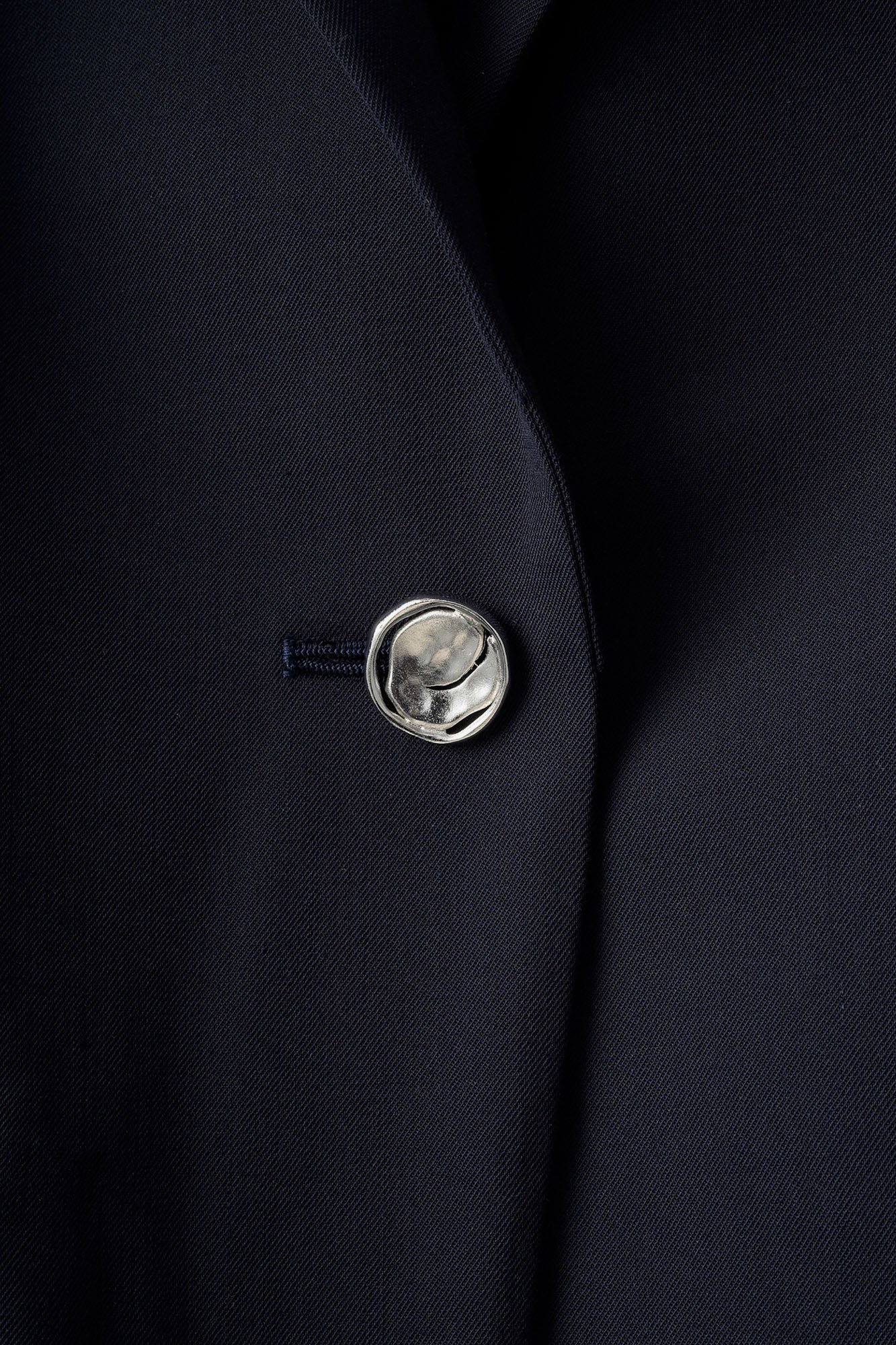 素材にはハリコシのあるウールギャバを使用し、欠けたようなモチーフのオリジナル釦が全体のアクセントに。