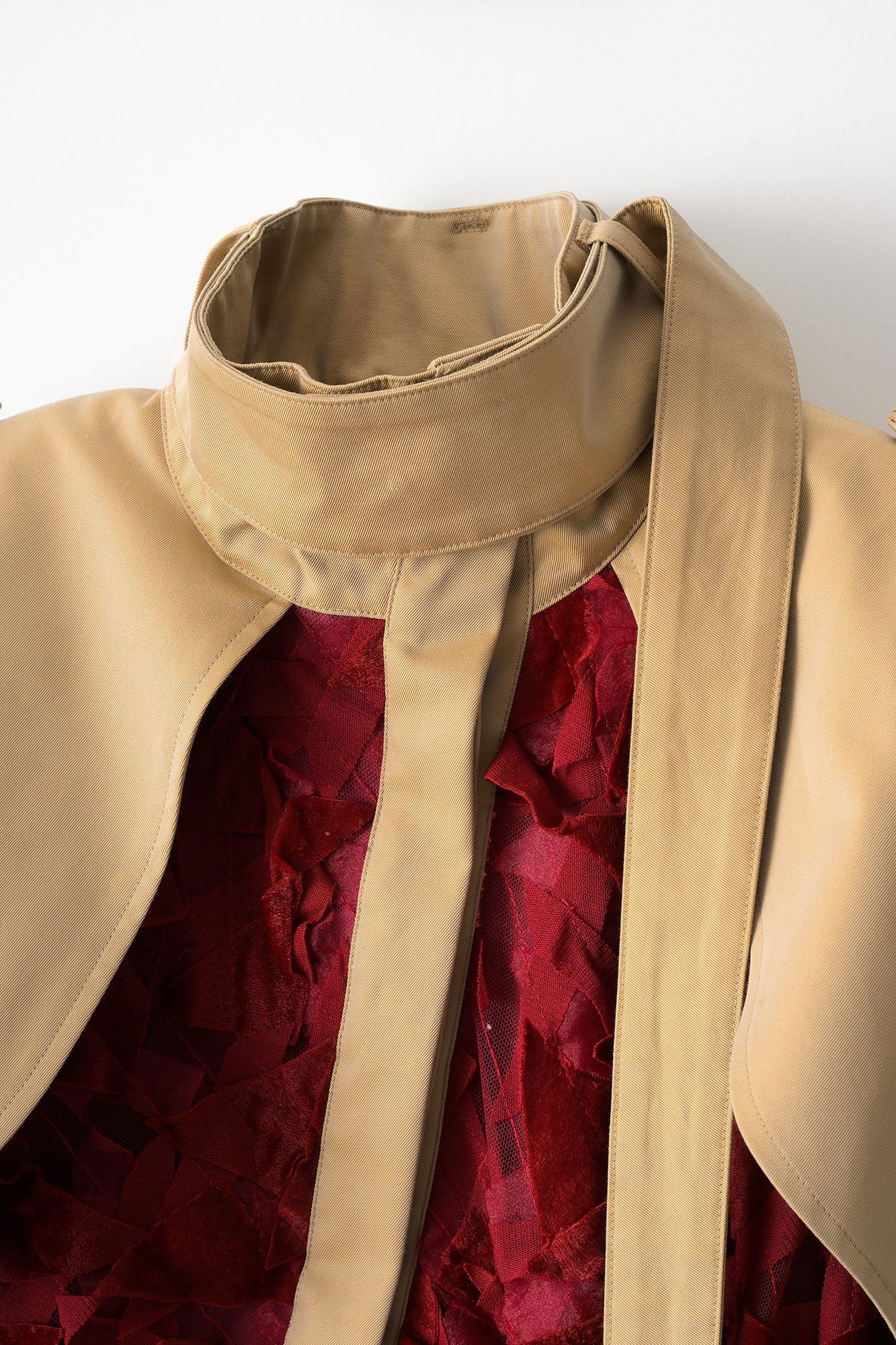 ケープはボタンによる調節が可能でスタイリングにより表情を変える1着。