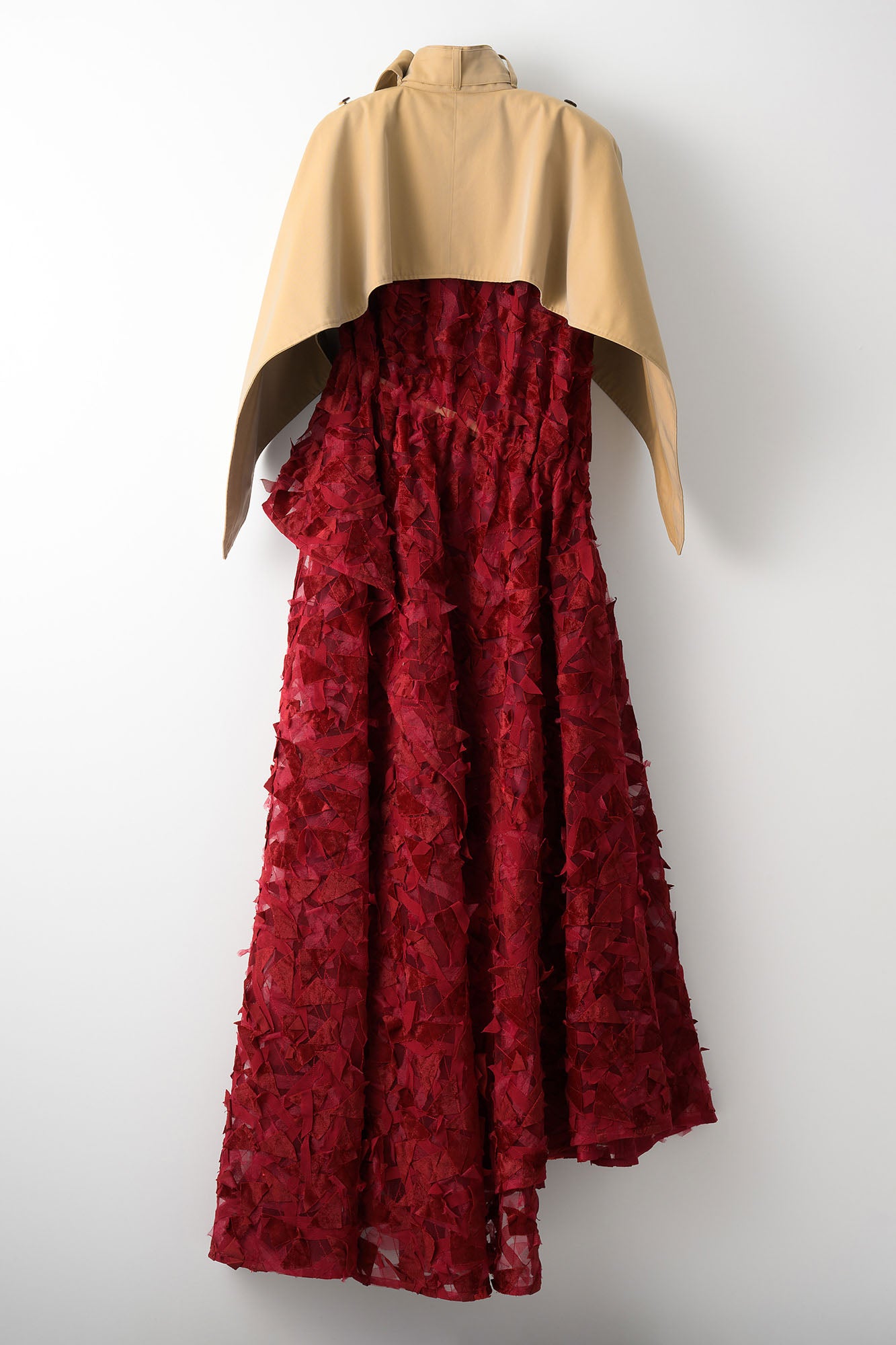 トレンチディティールをベースにアシンメトリーのスカートラインが繊細で力強い表情を生み出すドレス。
