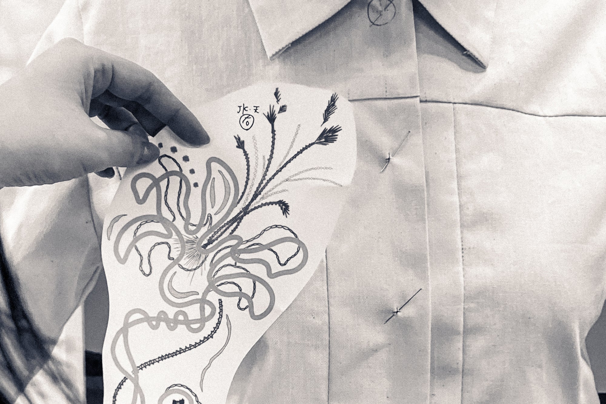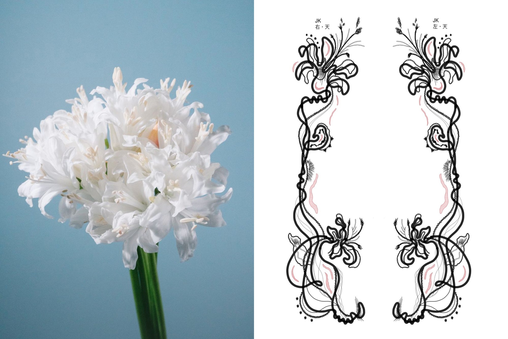 デザイナー関口の手描きのデザインにより生み出された刺繍は、光によって宝石のような輝き放つダイヤモンドリリーをインスピレーションに、香川県にて加工しました。