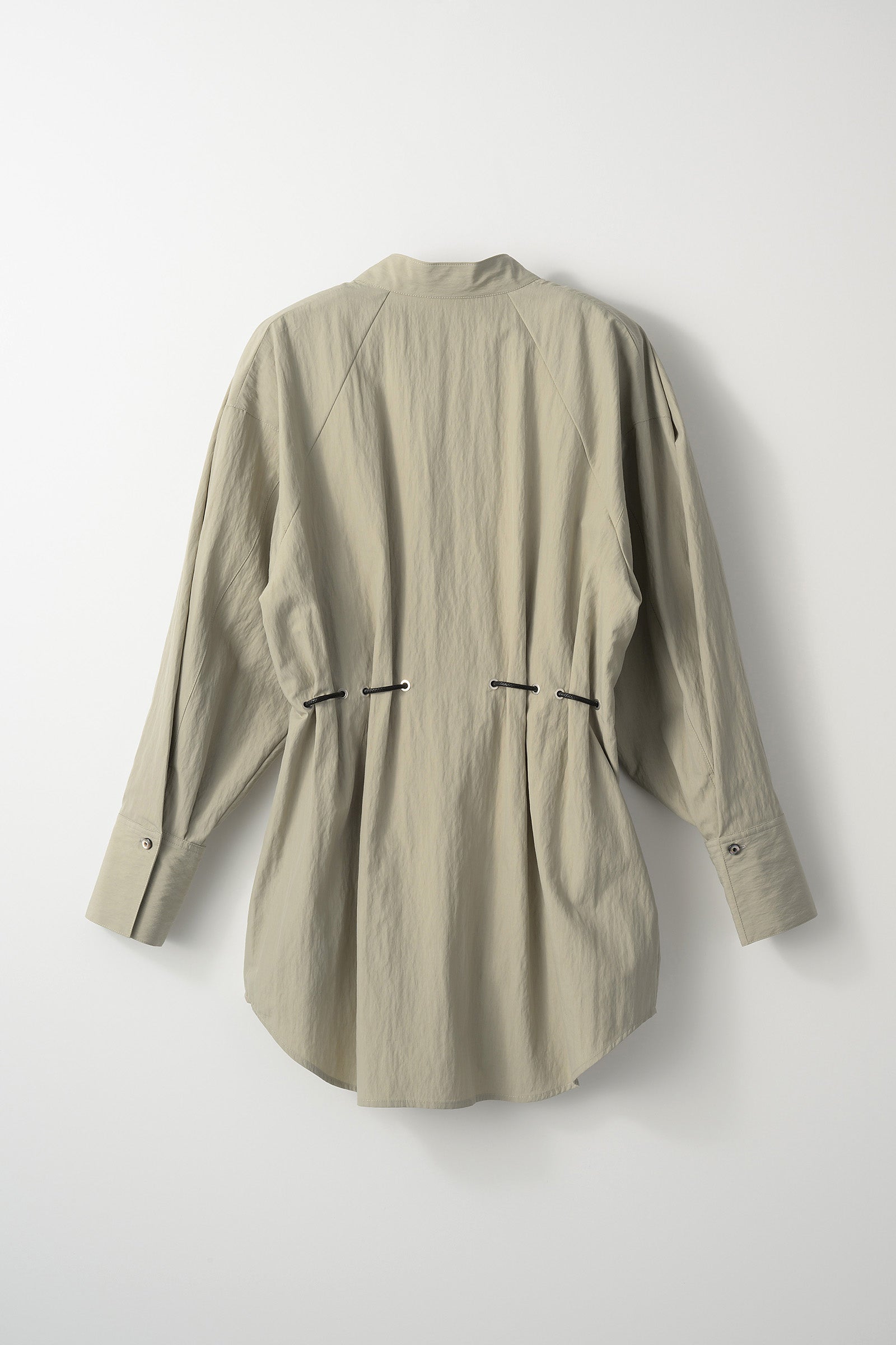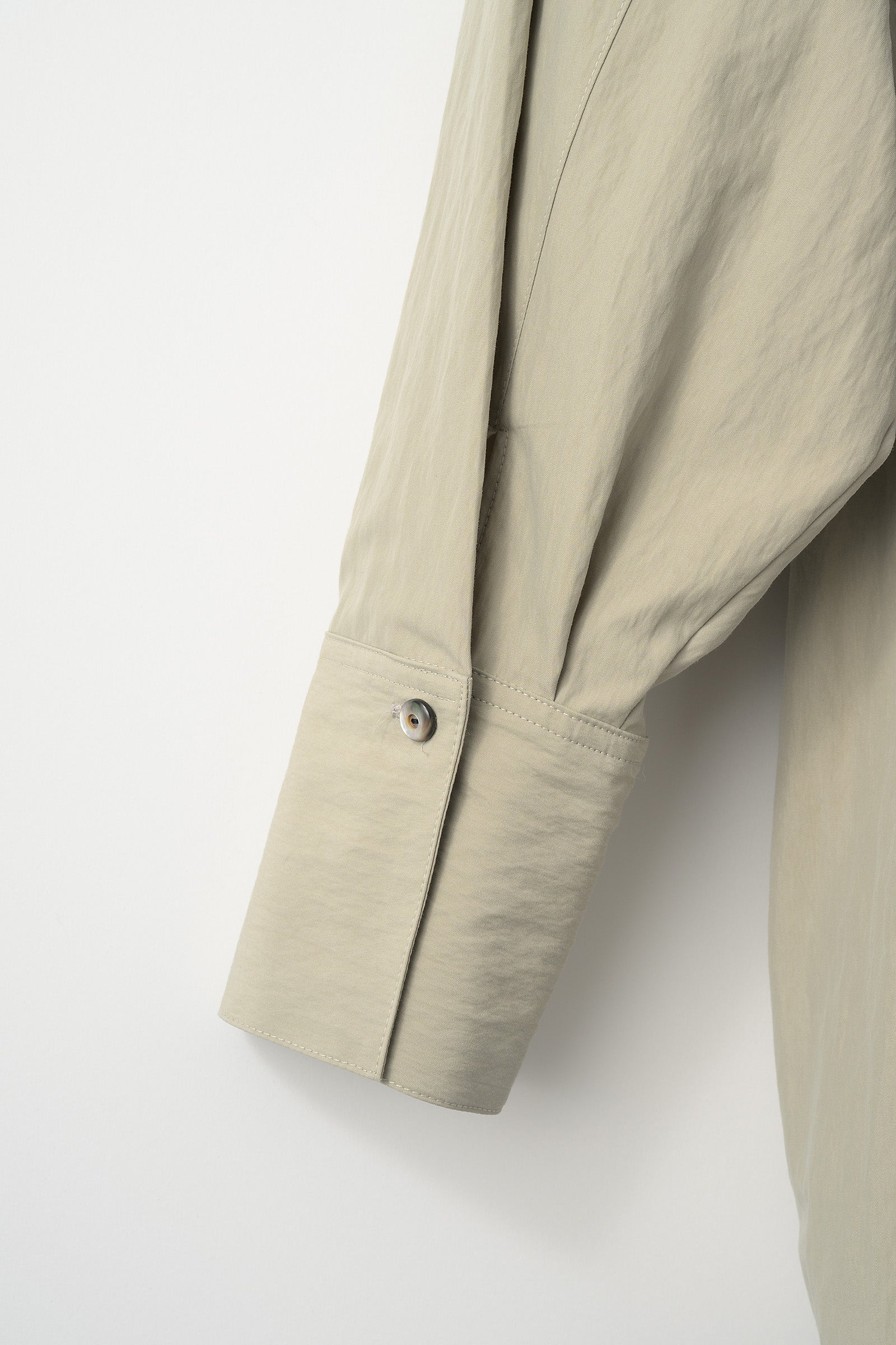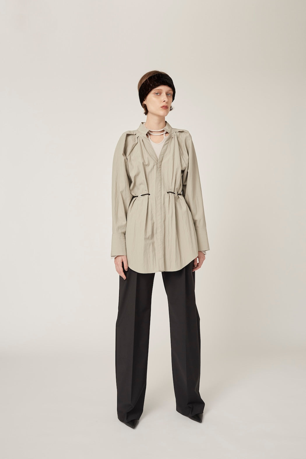 経糸に綿を高密度に織り上げたギャバジンのシャツは高密度に織り上げることで程よいコシと反発力があり、更に緯糸にナイロンを使用する事でナチュラルな雰囲気に。複雑なパターンメイキングから生まれる立体的なボリュームスリーブ。ウエストにはコーティングされた紐が完備されており、ブラウジングによりウエスト調節も可能。程よく開いた首元のVネックがカジュアル過ぎない優雅な佇まいを演出します。
