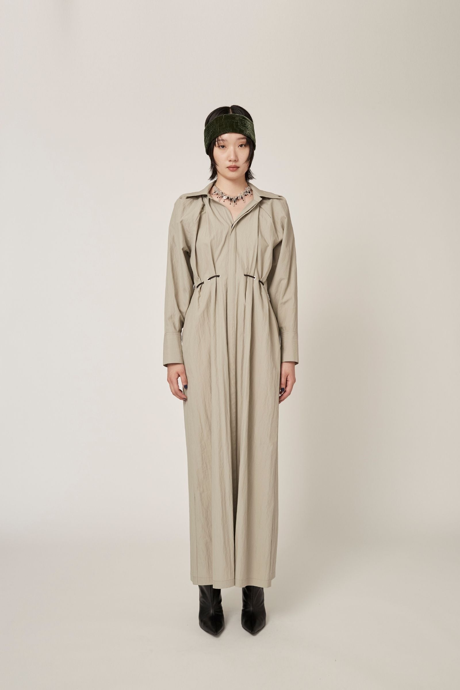 経糸に綿を高密度に織り上げたギャバジンのシャツは高密度に織り上げることで程よいコシと反発力があり、更に緯糸にナイロンを使用する事でナチュラルな雰囲気に。複雑なパターンメイキングから生まれる立体的なボリュームスリーブ。ウエストにはコーティングされた紐が完備されており、ブラウジングによりウエスト調節も可能。程よく開いた首元のVネックがカジュアル過ぎない優雅な佇まいを演出します。ドレスとしてはもちろんボタンの開閉で羽織りとしても着用可能。