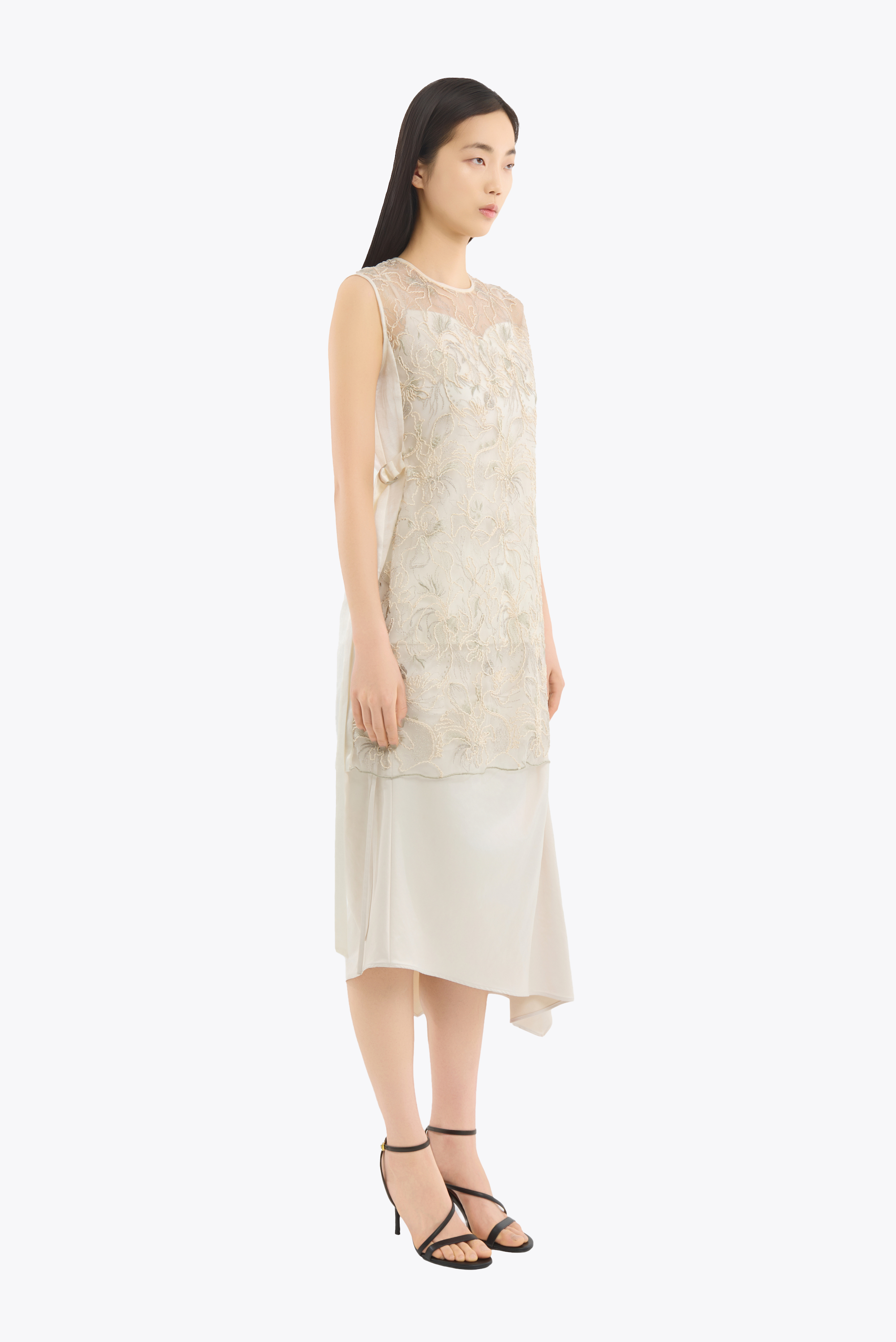 花びらの筋のようなカッティングのドレープがエレガントな印象を与える。裾はランダムなヘムラインに仕上げることで動きに奥行きをもたらすと同時に足捌きを軽やかに演出する。素材とのコントラストでカジュアルなアイテムとも相性が良い1着。