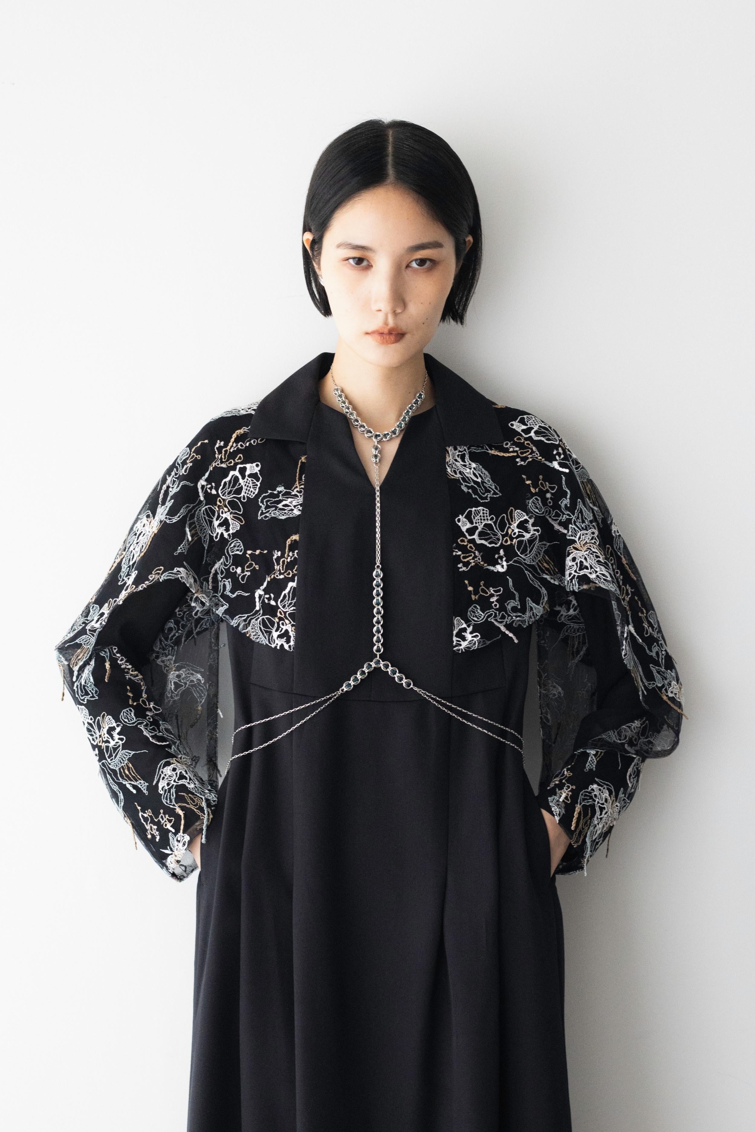ケミカルレースの刺繍技法と通常のエンブロイダリーレースの技法をミックスさせた特殊な技法を用いてより立体的な刺繍生地へと昇華。