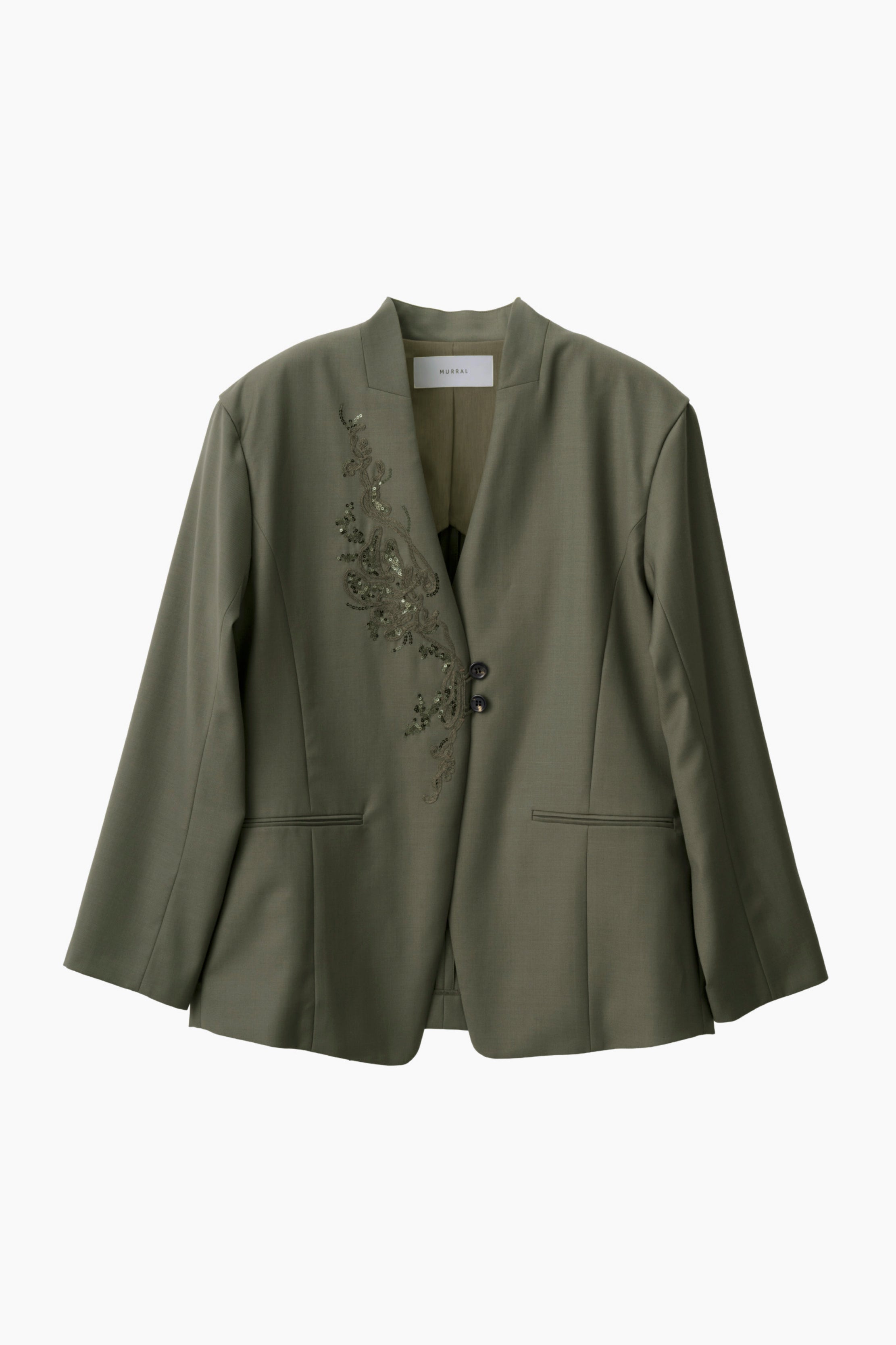 ディテールを削ぎ落としたシルエットがラインの美しさを浮かび上がらせると共に、スパンコール刺繍をより際立たせている。フロントに施された刺繍は福井県鯖江市にて製作。羽ばたく羽をモチーフに立体スパンコール刺繍とコード刺繍の2種類の刺繍技術を用いて表現。