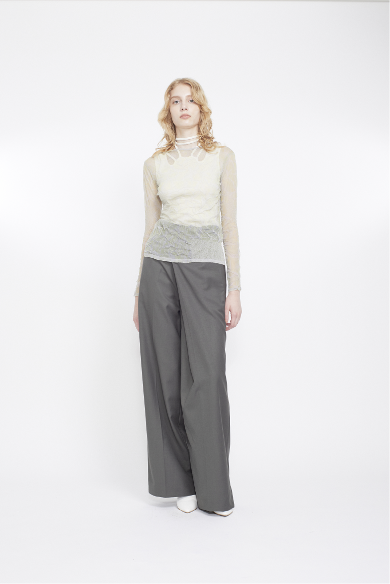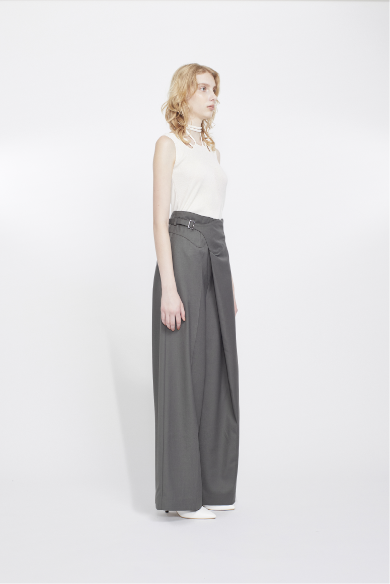 スーパー120'sのウール糸を使用し、繊細な光沢とドレープが特徴的な生地を採用したアーミーグルカトラウザーから着想を得た、アシンメトリーなシルエットのスラックス。