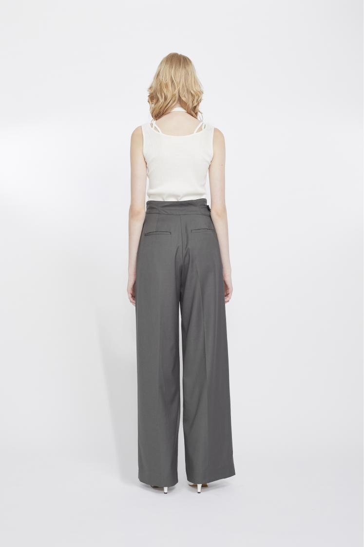 ポリエステル/ウールの柔らかく上品な素材は合わせるトップスを選ばない万能なアイテム。まるでベルトをしているかのような切替のデザインが特徴的。