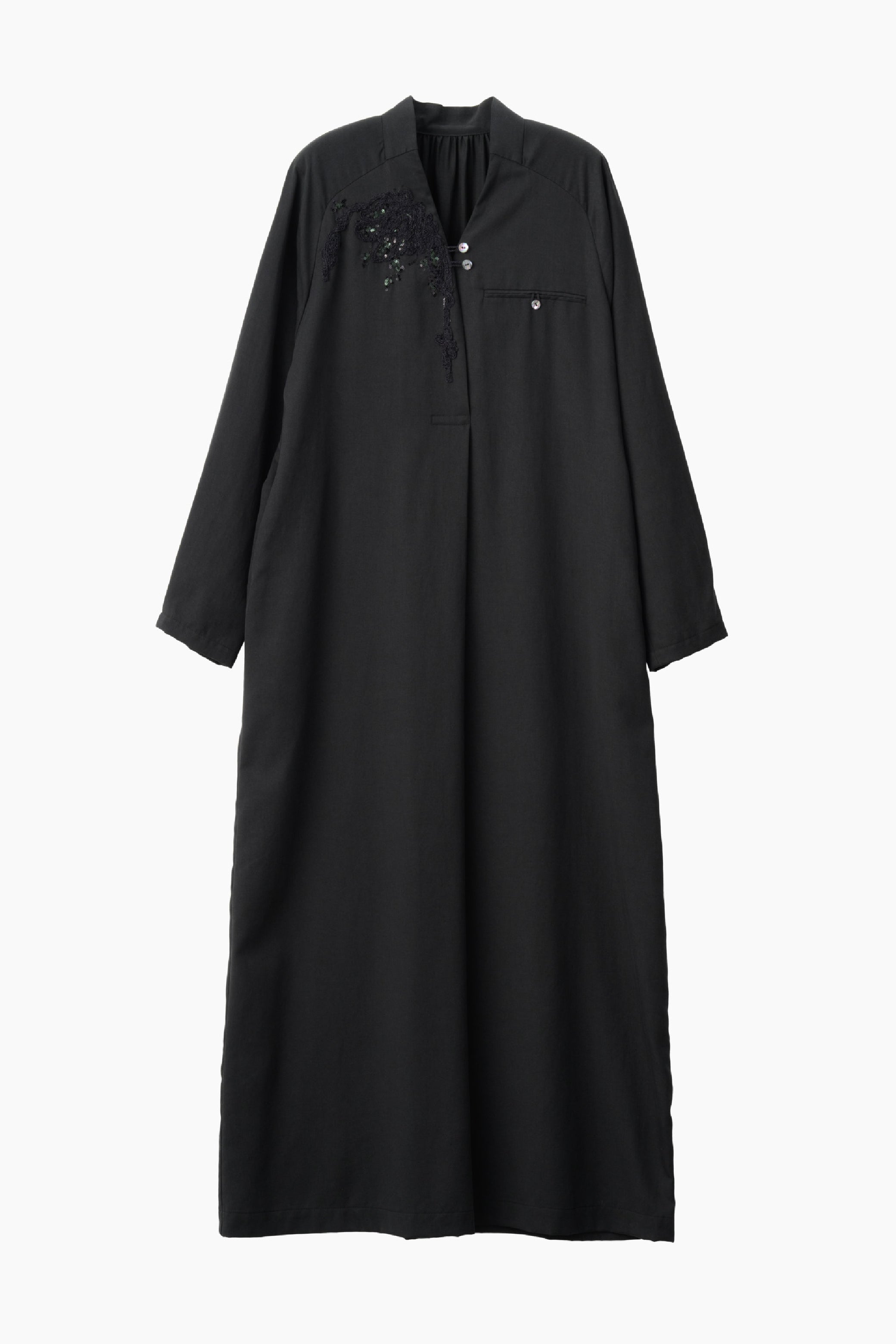 かすかな光を宿したような佇まいが印象的なドレス。腰回りに施された刺繍は福井県鯖江市にて製作。羽ばたく羽をモチーフに、立体スパンコール刺繍とコード刺繍の2種類の刺繍技術を用いて表現。スパンコール刺繍はトーン違いの2種類の色を混ぜ合わせ、陰影のある色彩が奥行きを生み出し、コード刺繍と組み合わせることにより羽のモチーフをより立体的に描き出している。クラシカルとカジュアルが混在しているような佇まいのドレスは、リヨセルとコットンを混紡し美しいドレープとナチュラルタッチが特徴的な素材を採用。更にバイオ加工を施すことで柔らかさを際立たせている。ご家庭での手洗いも可能でデイリーからオケージョンまで幅広いシーンで着用可能な1着。