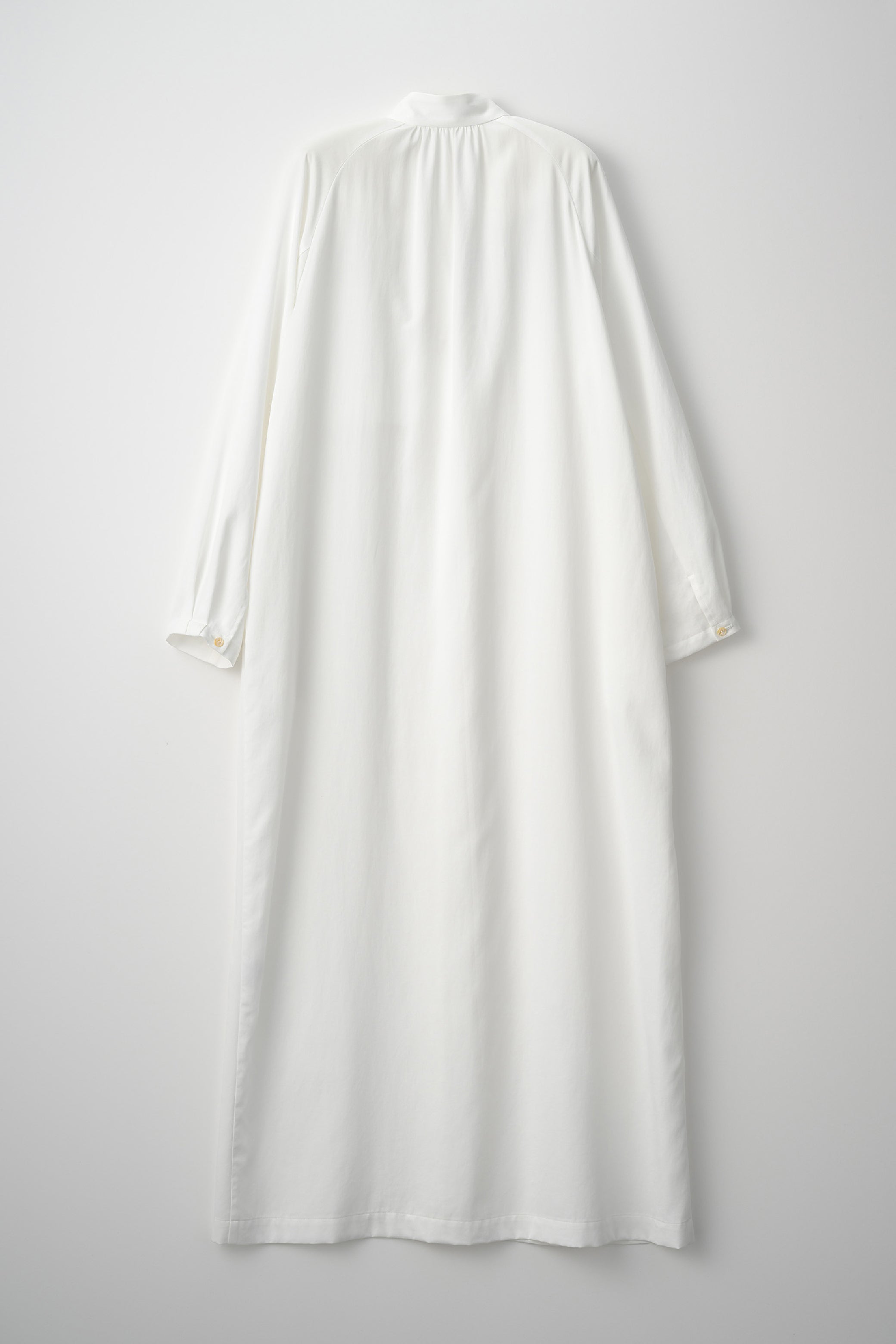 かすかな光を宿したような佇まいが印象的なドレス。腰回りに施された刺繍は福井県鯖江市にて製作。羽ばたく羽をモチーフに、立体スパンコール刺繍とコード刺繍の2種類の刺繍技術を用いて表現。スパンコール刺繍はトーン違いの2種類の色を混ぜ合わせ、陰影のある色彩が奥行きを生み出し、コード刺繍と組み合わせることにより羽のモチーフをより立体的に描き出している。クラシカルとカジュアルが混在しているような佇まいのドレスは、リヨセルとコットンを混紡し美しいドレープとナチュラルタッチが特徴的な素材を採用。更にバイオ加工を施すことで柔らかさを際立たせている。ご家庭での手洗いも可能でデイリーからオケージョンまで幅広いシーンで着用可能な1着。