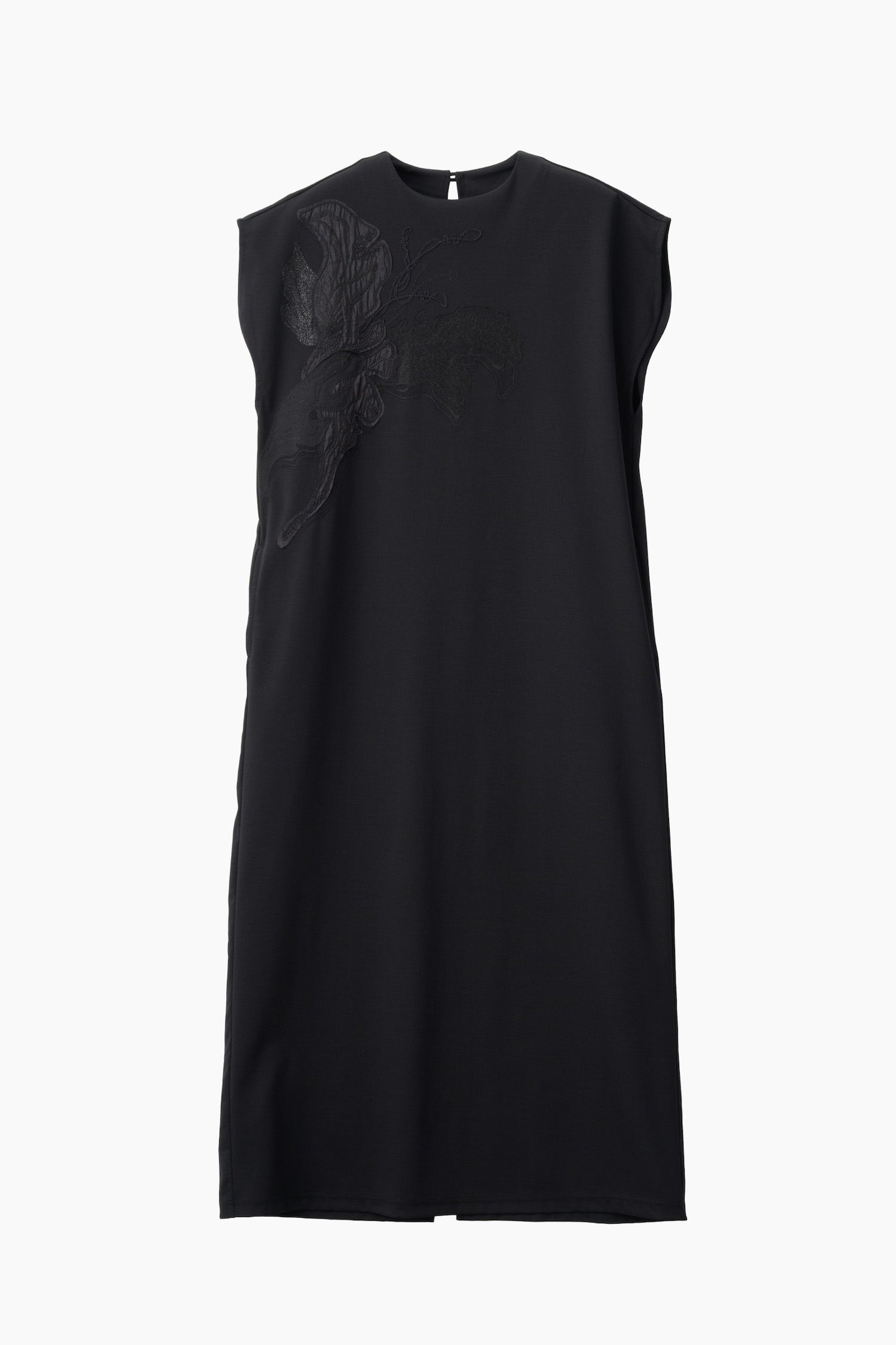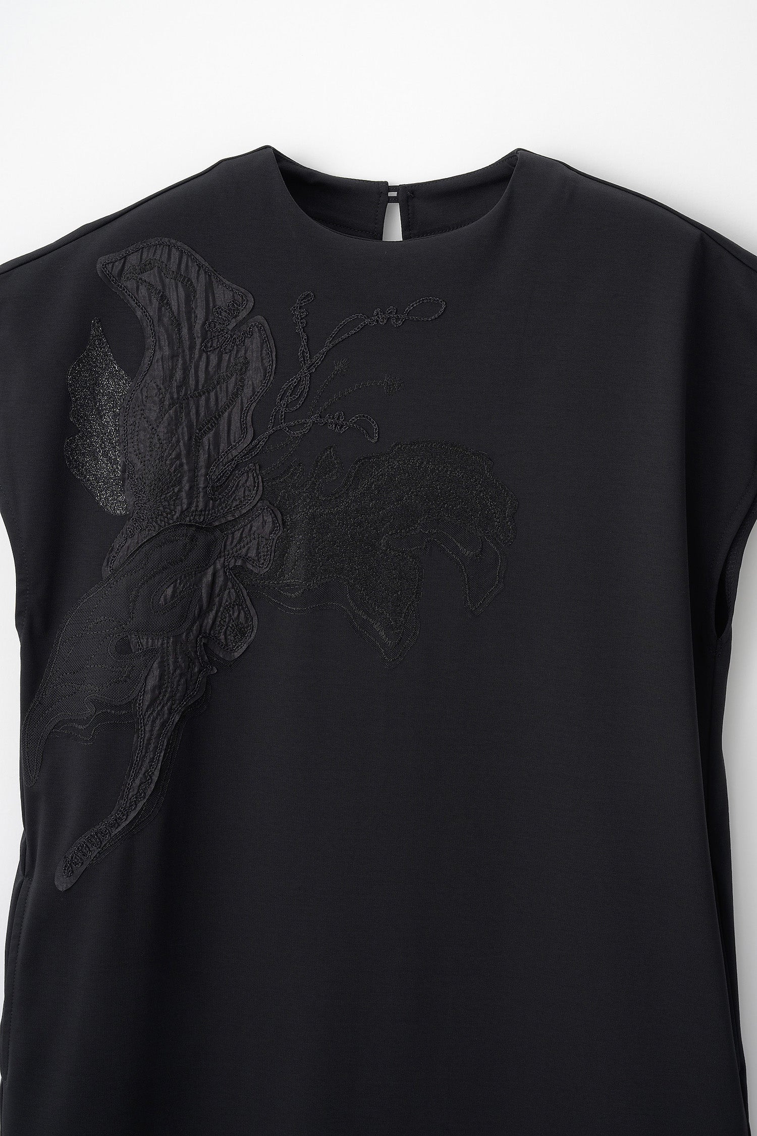 パッチワーク刺繍はチュールやオーガンジー、シアー素材などの全5種類の素材を使用し、立体的かつ軽さのあるデザインに構築。