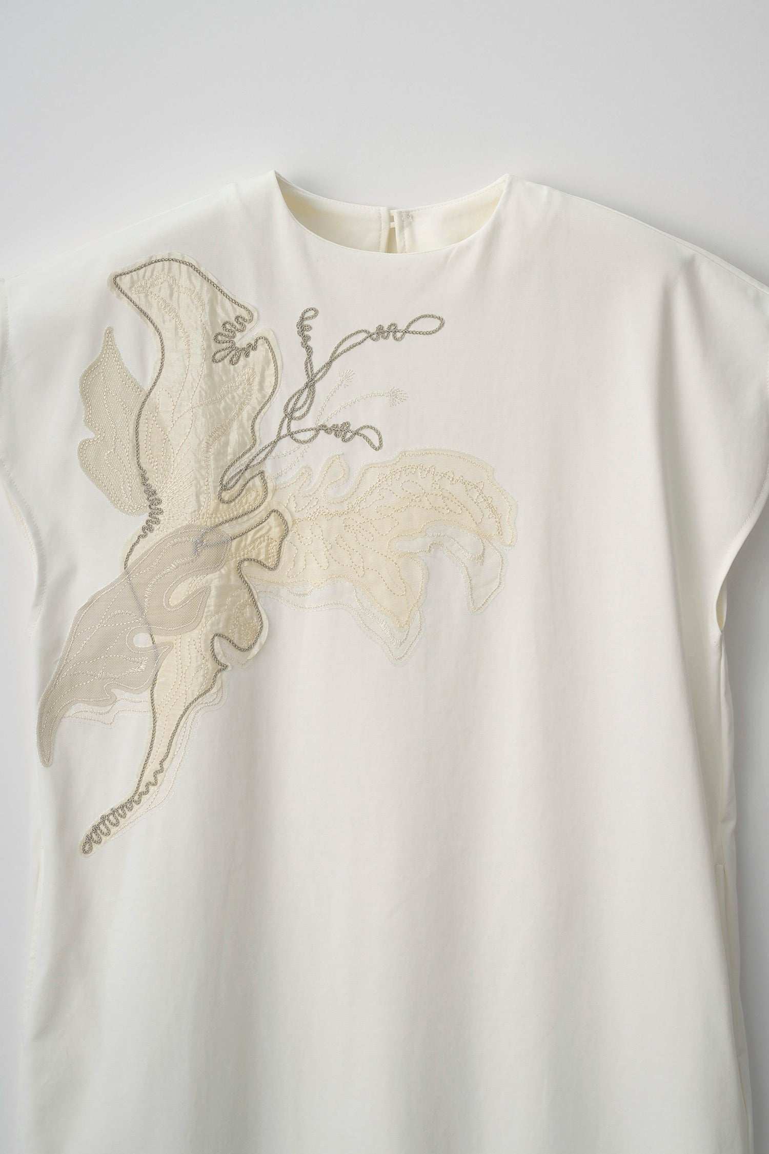 淡い光を浴び空に向け花を咲かす姿をパッチワーク刺繍で表現したドレス。パッチワーク刺繍はチュールやオーガンジー、シアー素材などの全5種類の素材を使用し、立体的かつ軽さのあるデザインに構築。