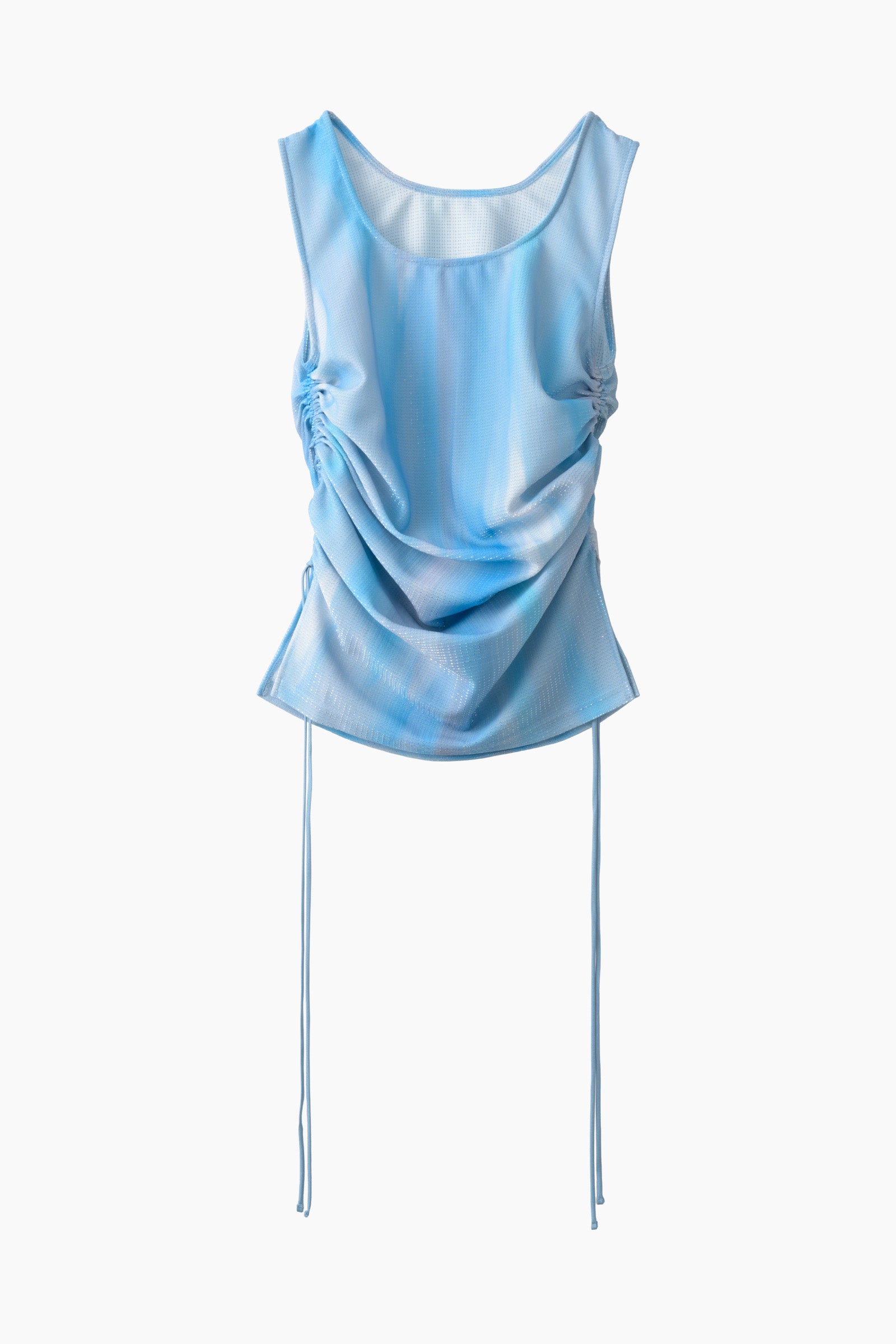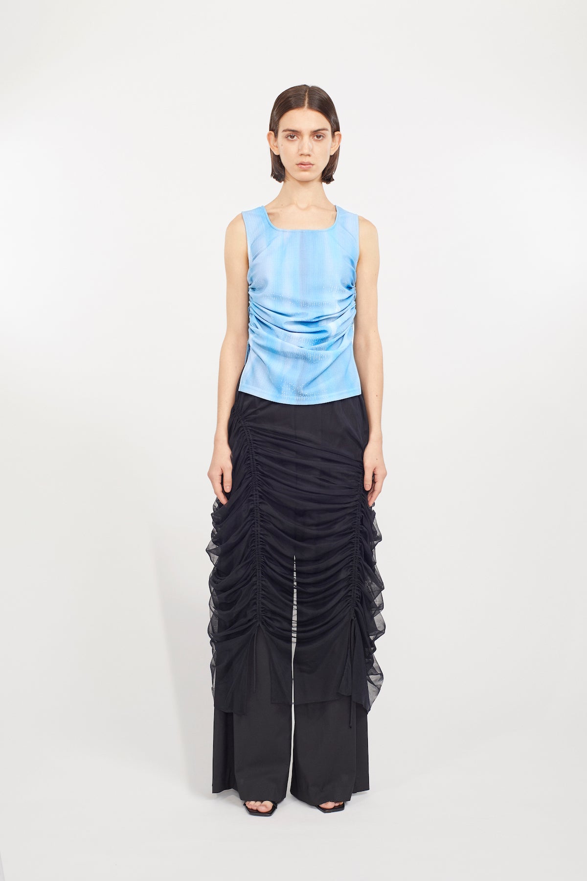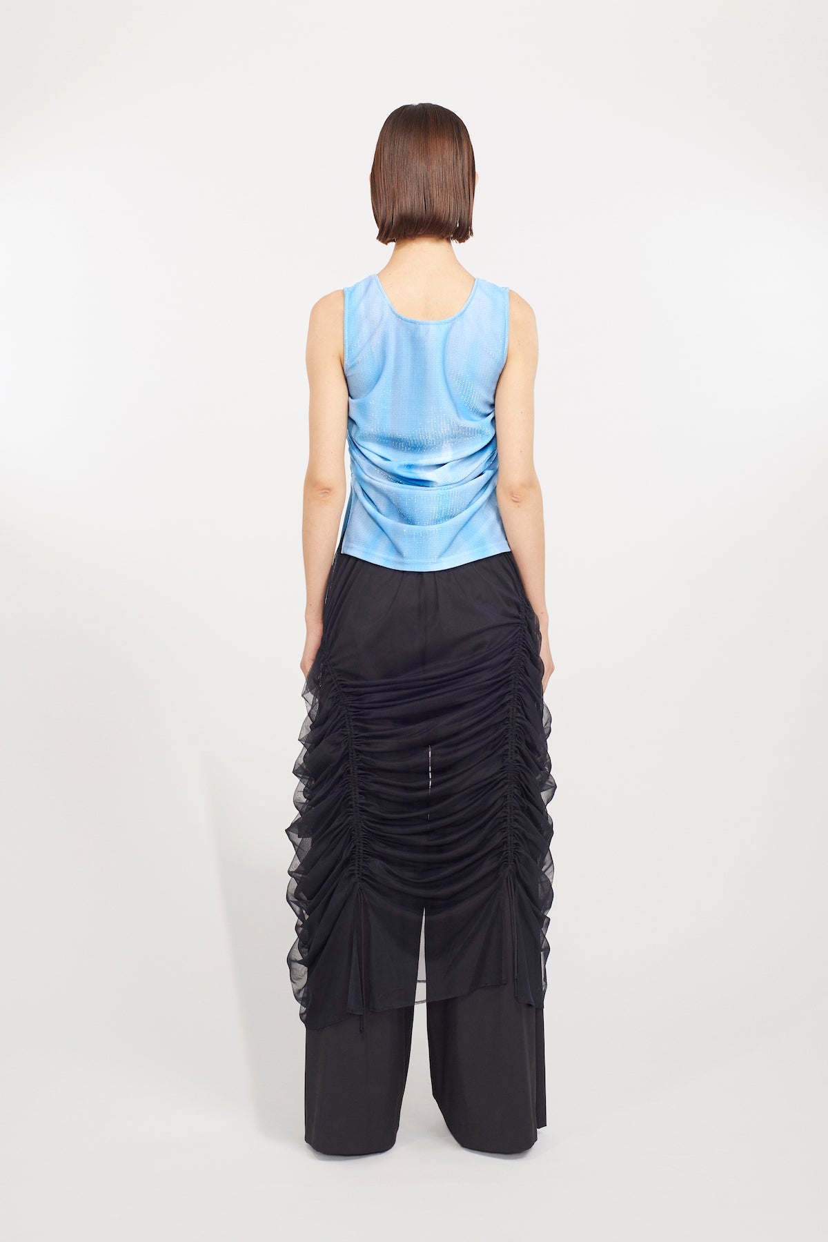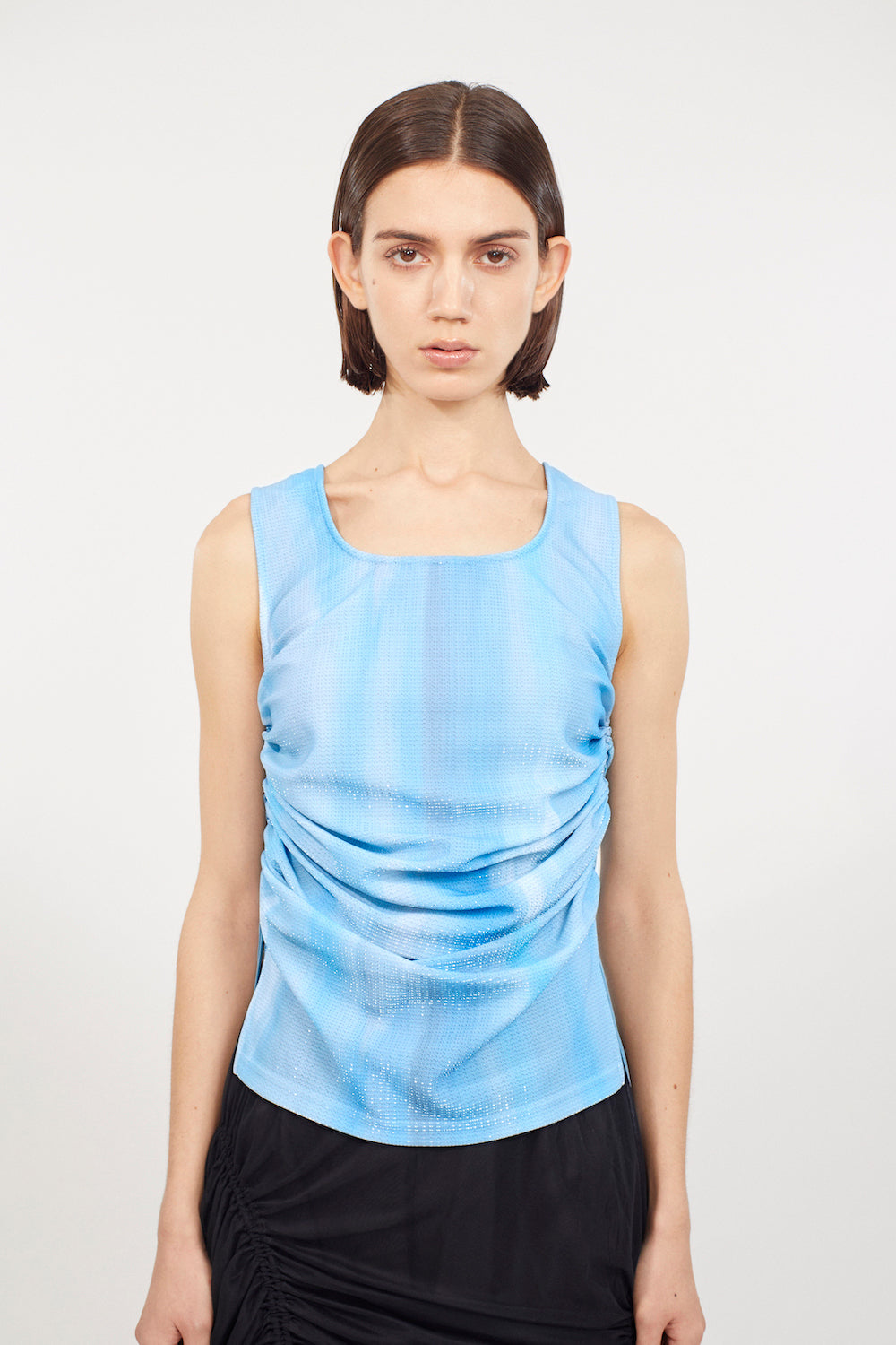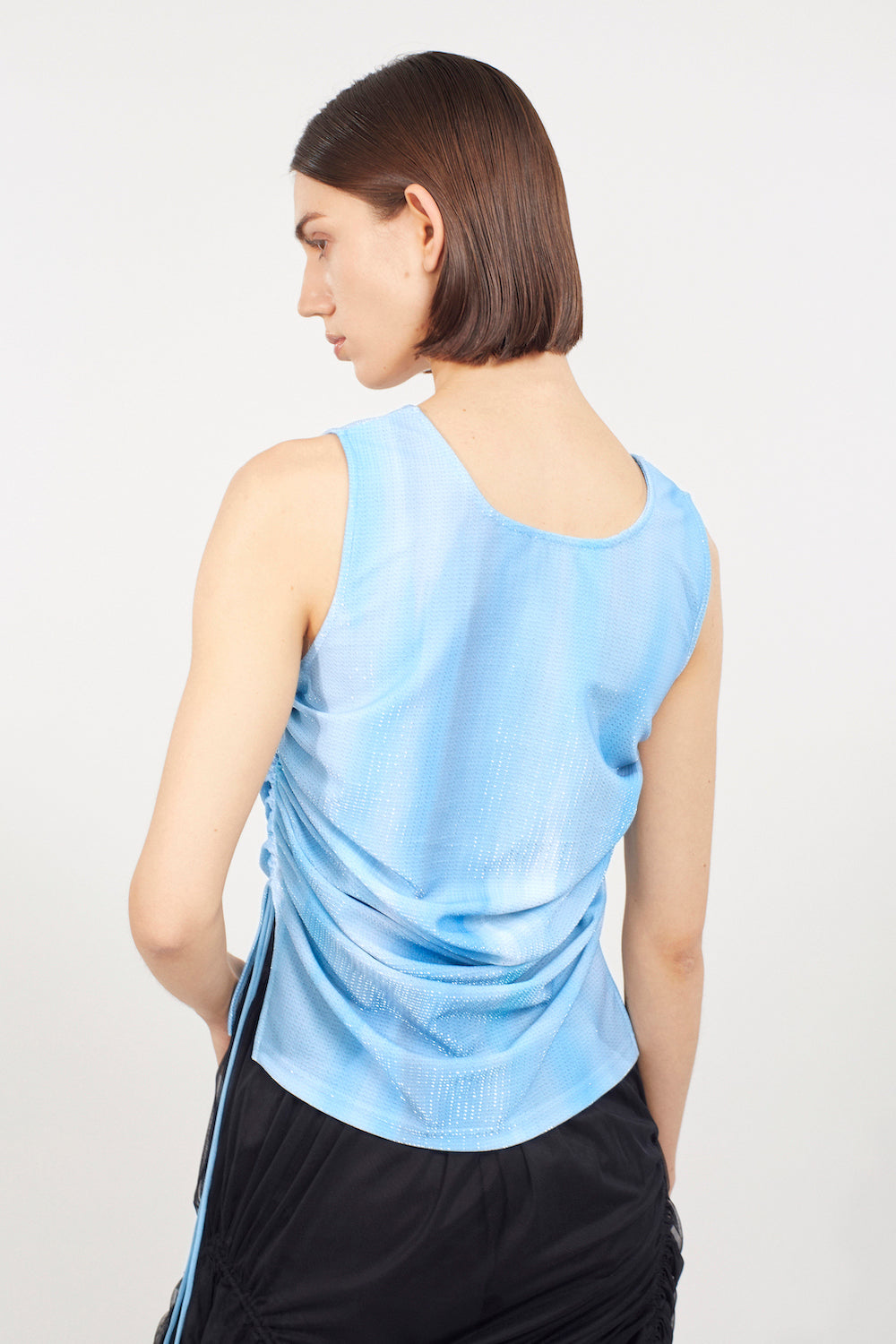 まるで光が乱反射したような奥行きのある輝きが特徴的なテキスタイルを使用したトップス。