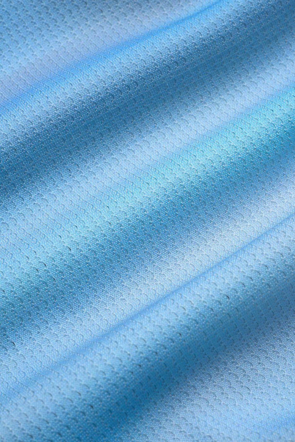 別注の厚みを持たせたラメ糸をポリエステルと編み込み、ラメ糸を立たせることで糸に角度が生まれ光の当たり方によって輝き方が変わるこのテキスタイルは群馬県桐生市にて製作。プリントモチーフはデザイナー関口のライフワークでもある手づけのビーズ刺繍のテキスタイルに偶然光が反射し柄として浮かび上がったことから着想を得てグラフィックとして採用。