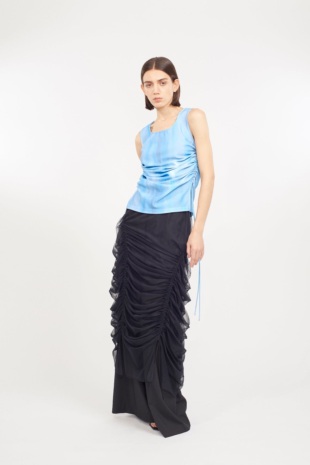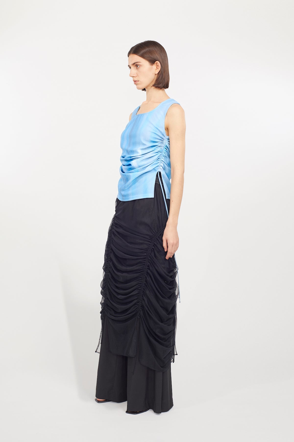 シルエットはシャーリングの調整により着丈のアレンジも可能の他、ドレープから生まれる表情がアイテムにより奥行きと立体感を生み出している。ご家庭での手洗いも可能でシワにもなりづらくバケーションなどにも最適な1着。