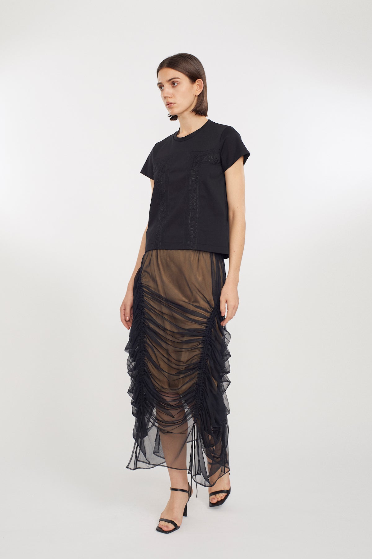キュプラ糸とレーヨン糸の2種類の糸を使い、平刺繍・チェーンステッチ刺繍・クロスステッチ刺繍の3種類の刺繍技術によって繊細かつ詩的な印象に。福井県で製作されたフレーム刺繍は針数も多く多種の刺繍技術を使用するため刺繍機の調整や手間と時間、繊細な職人技術を必要とする。土台生地には肉感のしっかりとしたコットンベースのポンチを採用。程よいハリ感とドレープがシルエットをより立体的に映し出す。ご家庭での手洗いも可能でデイリーシーンに最適な1着に。