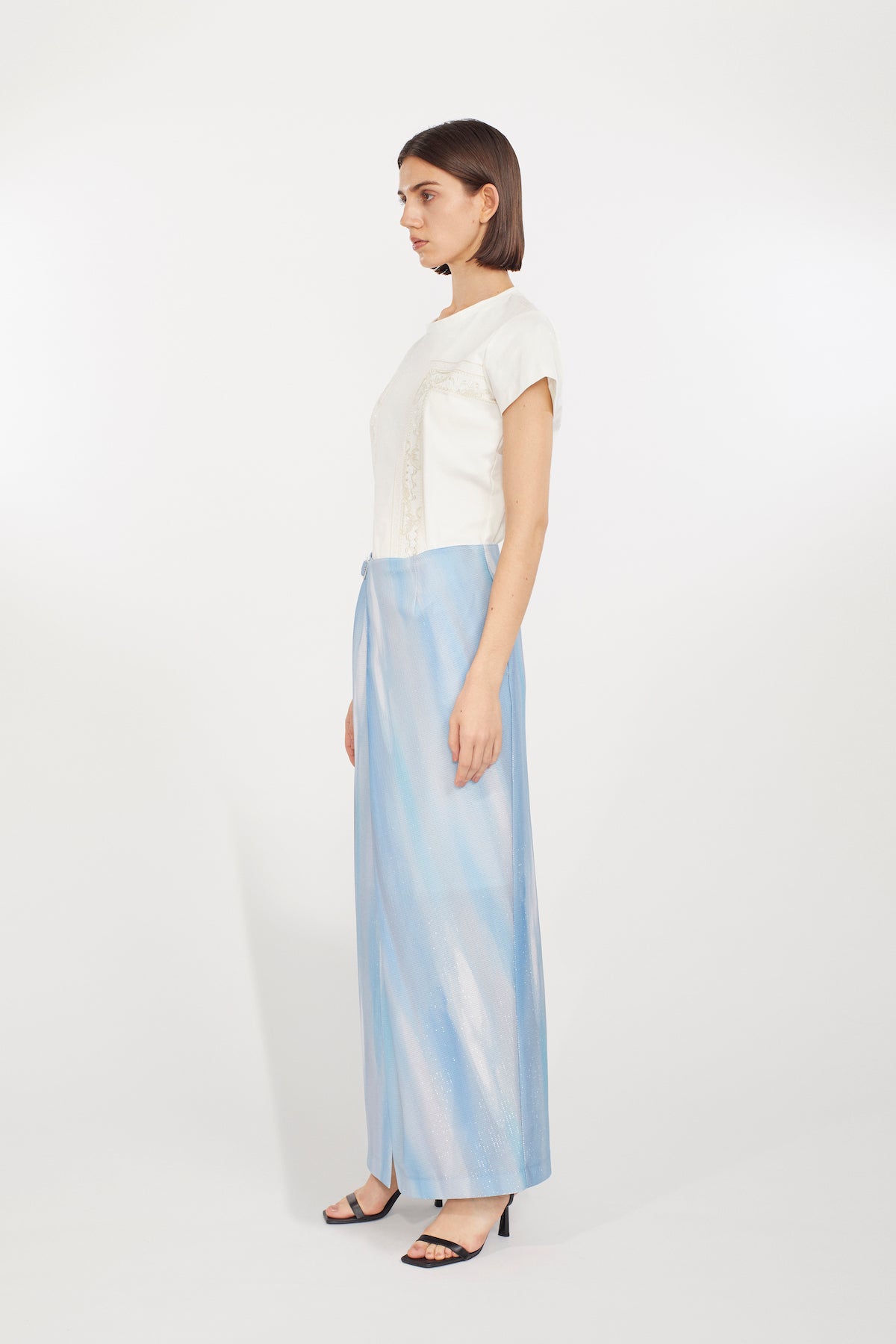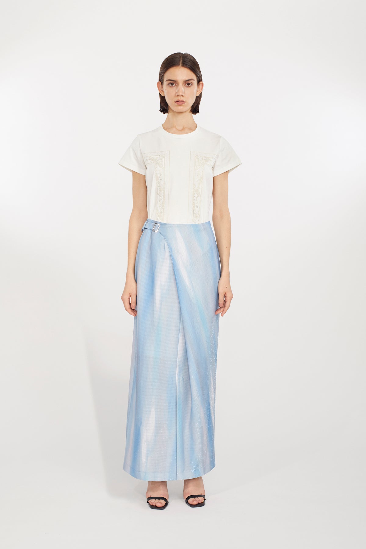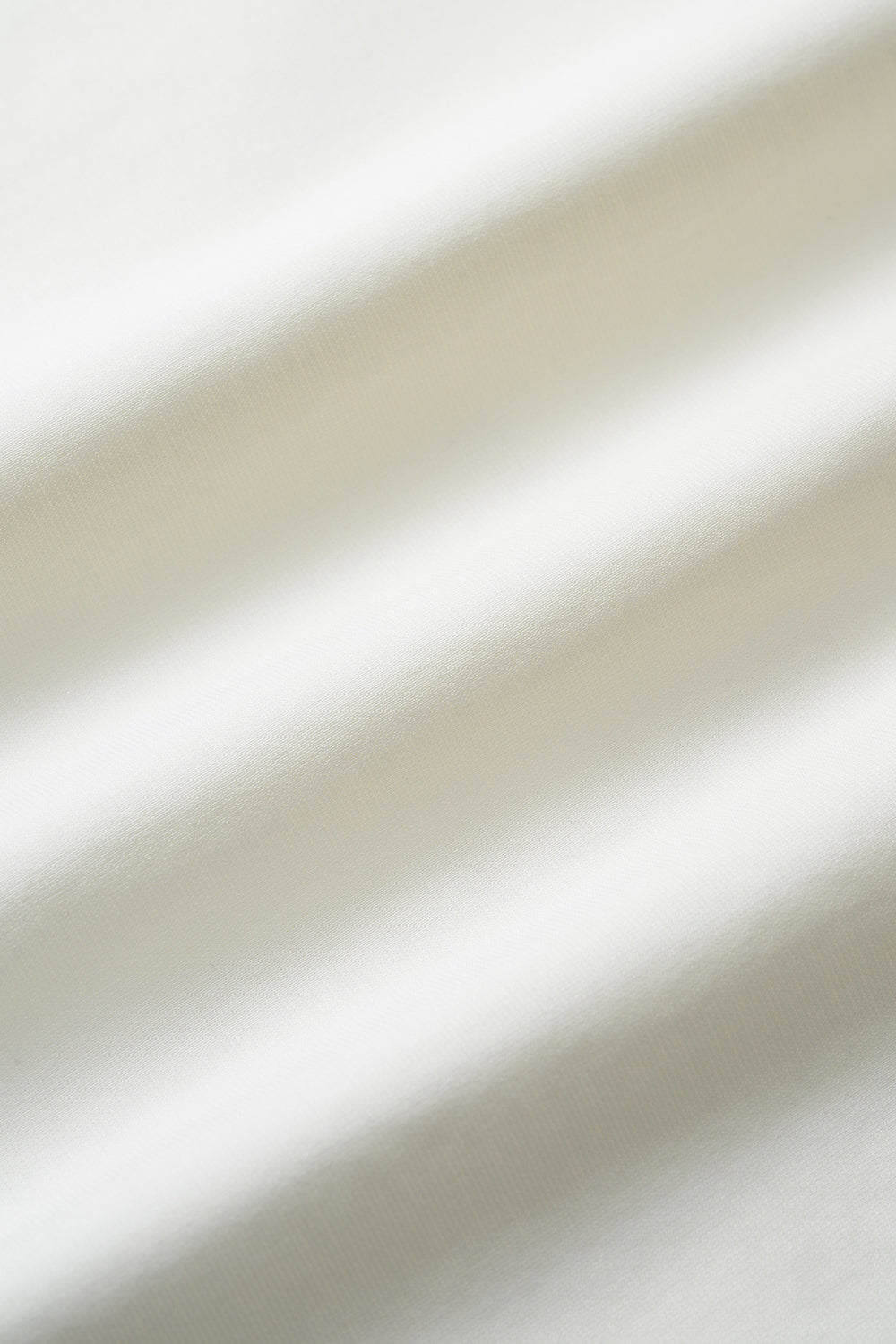 キュプラ糸とレーヨン糸の2種類の糸を使い、平刺繍・チェーンステッチ刺繍・クロスステッチ刺繍の3種類の刺繍技術によって繊細かつ詩的な印象に。福井県で製作されたフレーム刺繍は針数も多く多種の刺繍技術を使用するため刺繍機の調整や手間と時間、繊細な職人技術を必要とする。土台生地には肉感のしっかりとしたコットンベースのポンチを採用。程よいハリ感とドレープがシルエットをより立体的に映し出す。ご家庭での手洗いも可能でデイリーシーンに最適な1着に。