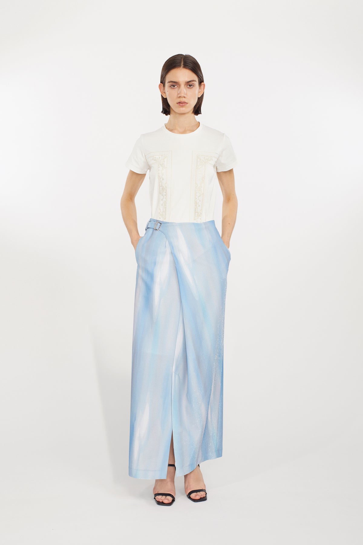 ブランドのフィロソフィーを体現するかのようなフレーム刺繍シリーズ。デザイナー関口の手描きの図案から生まれる刺繍は今まで様々な花を彩り飾ってきた。2026プレフォールコレクションからは新しくフレーム刺繍のジャージーシリーズがラインナップ。