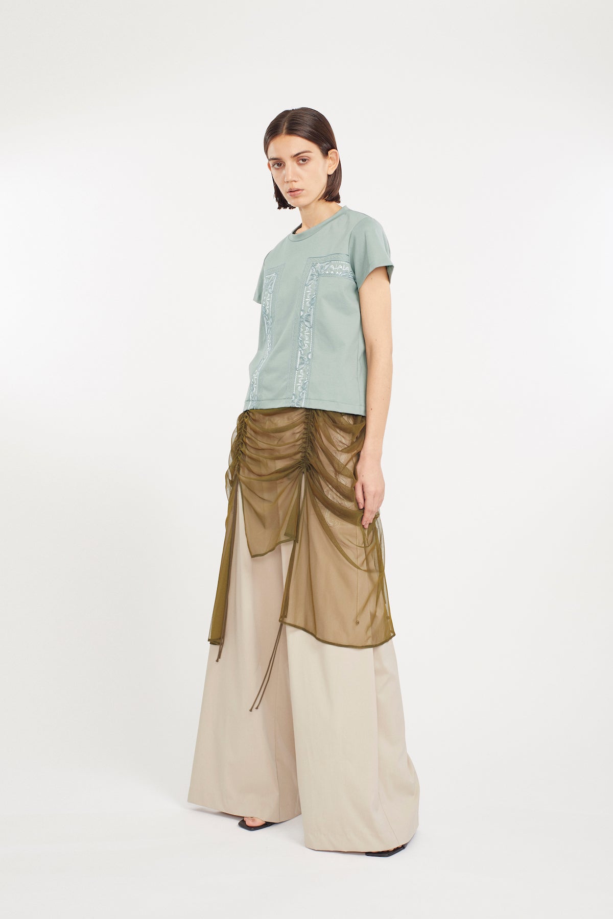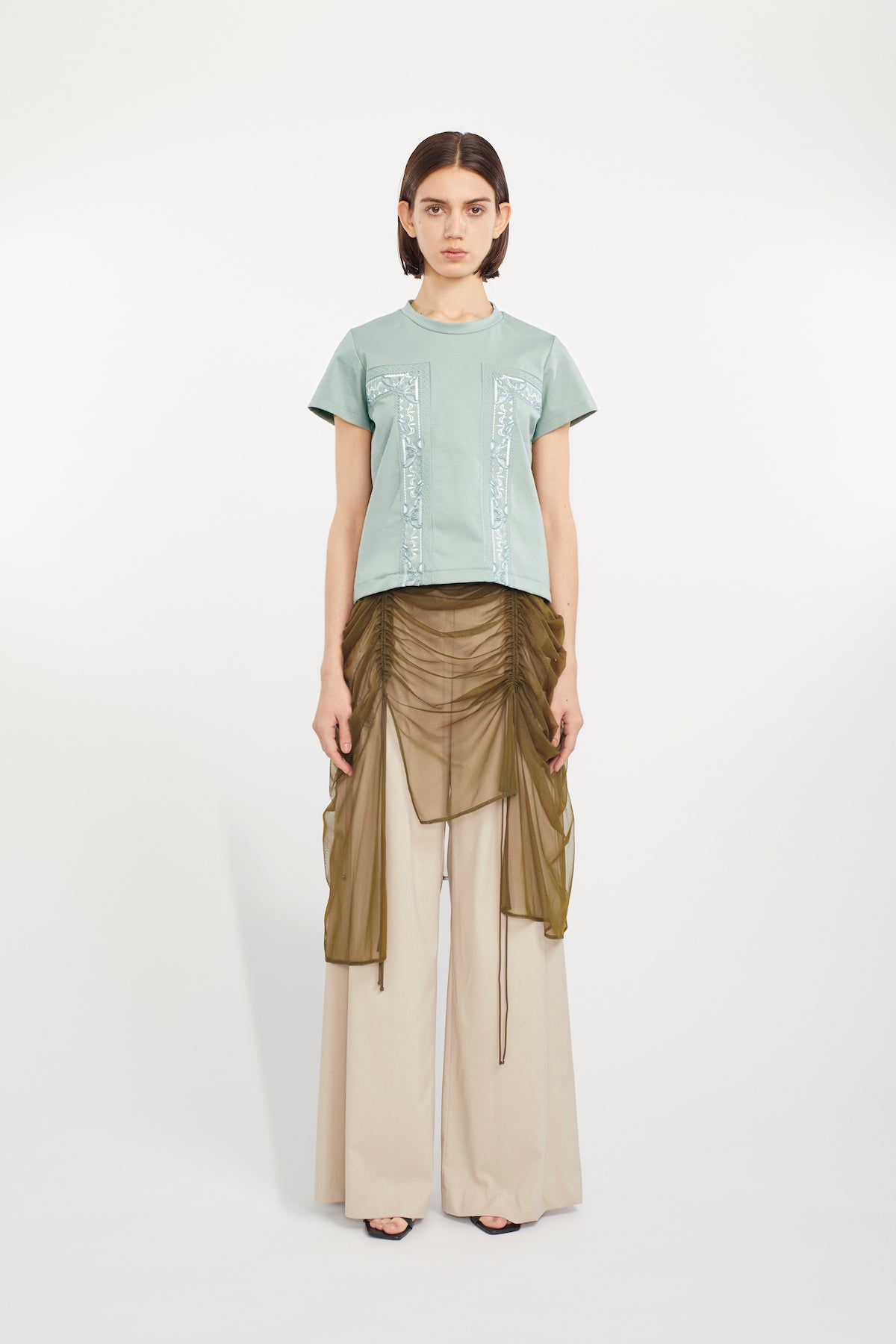キュプラ糸とレーヨン糸の2種類の糸を使い、平刺繍・チェーンステッチ刺繍・クロスステッチ刺繍の3種類の刺繍技術によって繊細かつ詩的な印象に。福井県で製作されたフレーム刺繍は針数も多く多種の刺繍技術を使用するため刺繍機の調整や手間と時間、繊細な職人技術を必要とする。土台生地には肉感のしっかりとしたコットンベースのポンチを採用。程よいハリ感とドレープがシルエットをより立体的に映し出す。ご家庭での手洗いも可能でデイリーシーンに最適な1着に。