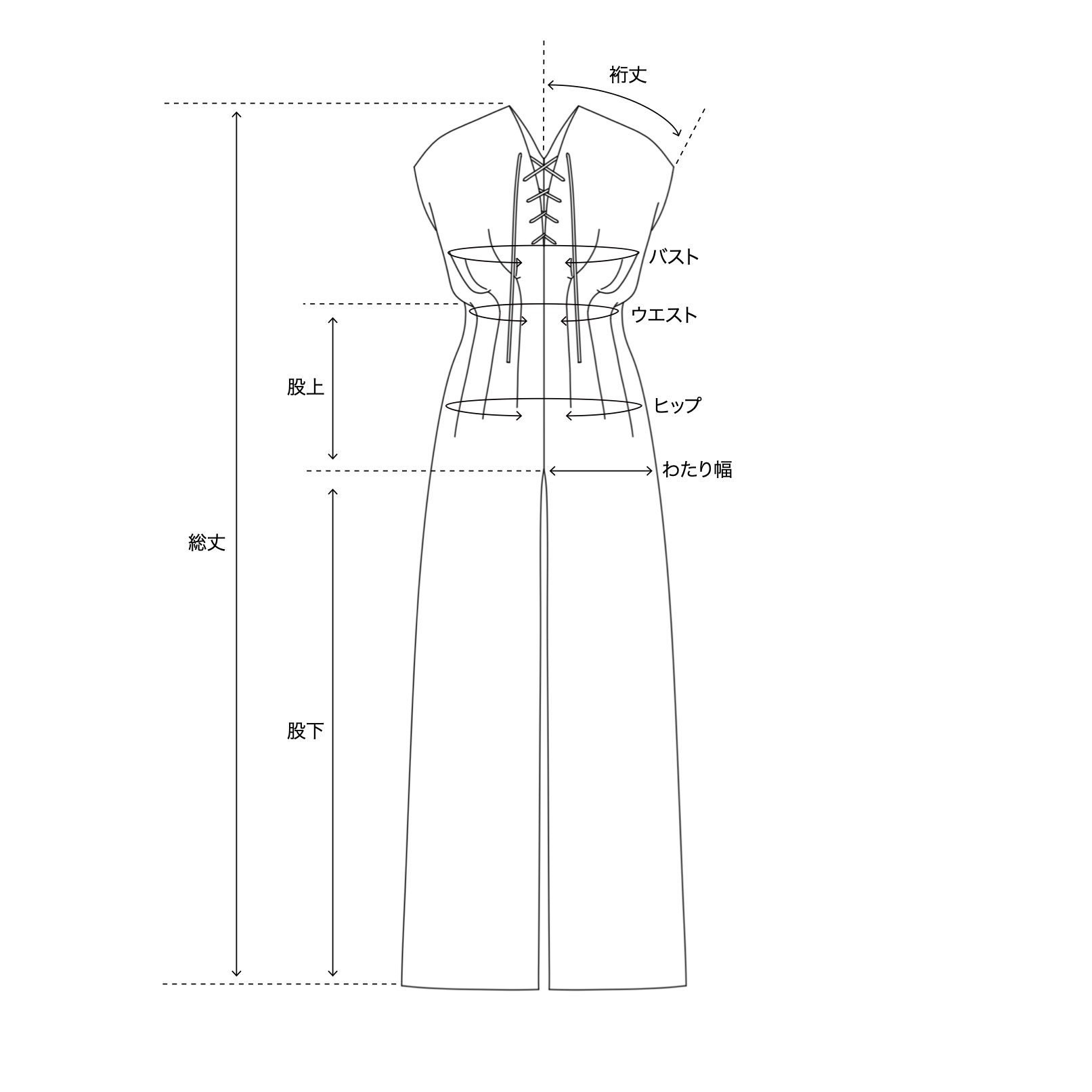 センシュアルな印象のジャンプスーツは程よくシェイプが効いたウエストから裾に向かって広がるストレートのボトムライン。首元のレースアップはセンシュアルな印象を与えると同時に顔まわりを美しく演出する。シーズン性を問わず、デイリーシーンやオケージョンシーンシーンにも最適。