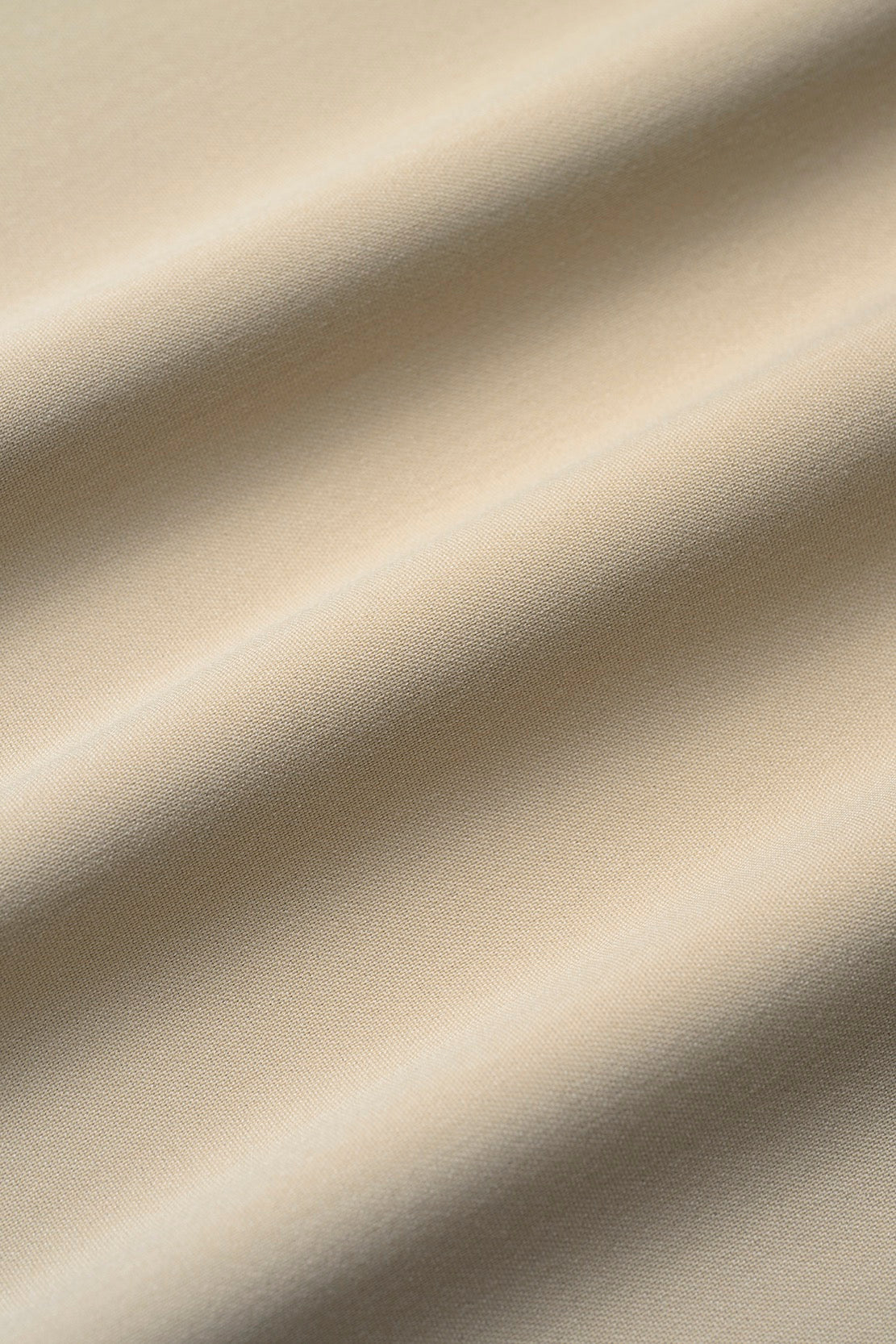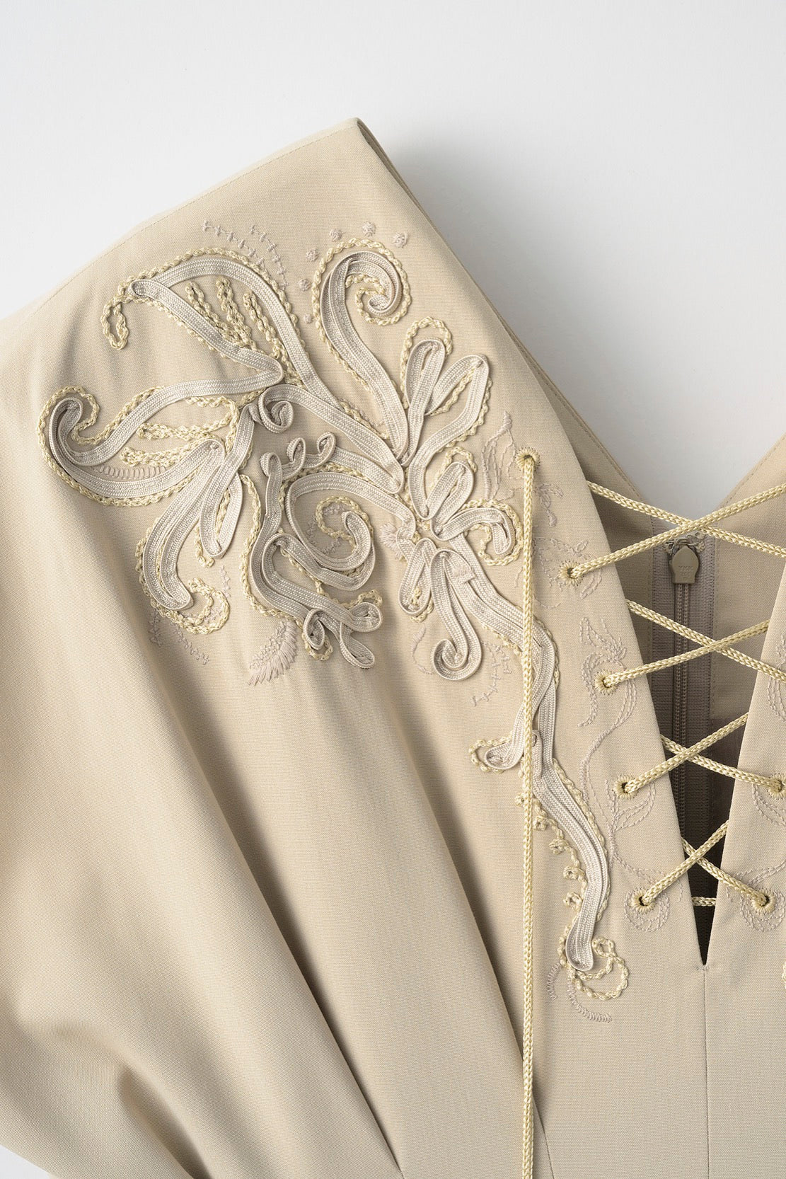 胸元に施された刺繍は香川県にて制作。ジャカード刺繍と2種類のコード刺繍を組み合わせ、レースアップディテールと刺繍を一体化した繊細かつ立体的なデザイン。3種類の刺繍技術を同一の刺繍機で行うため、刺繍機の機械調整や糸調子の調整など時間と職人の繊細な技術を必要とする。