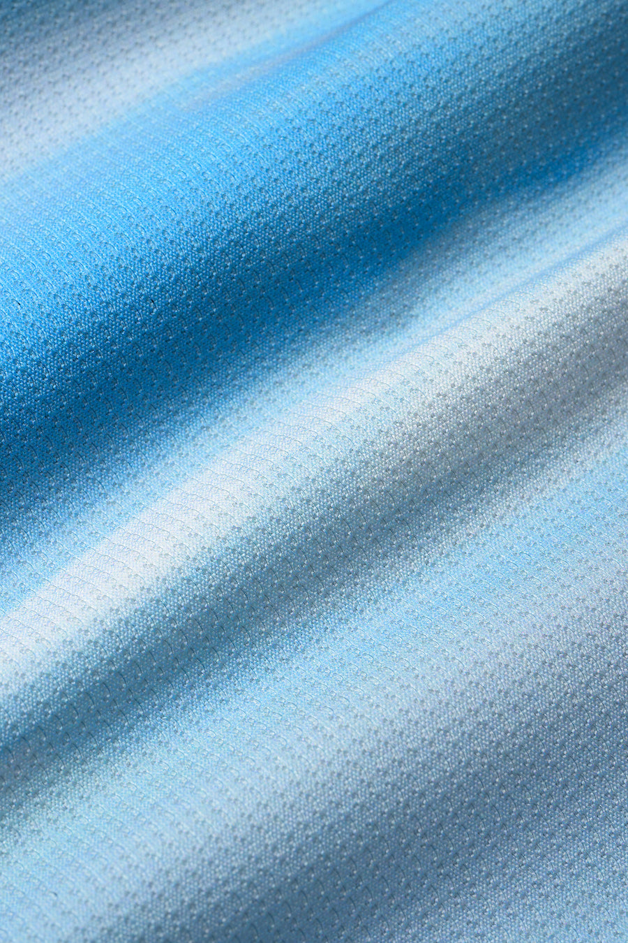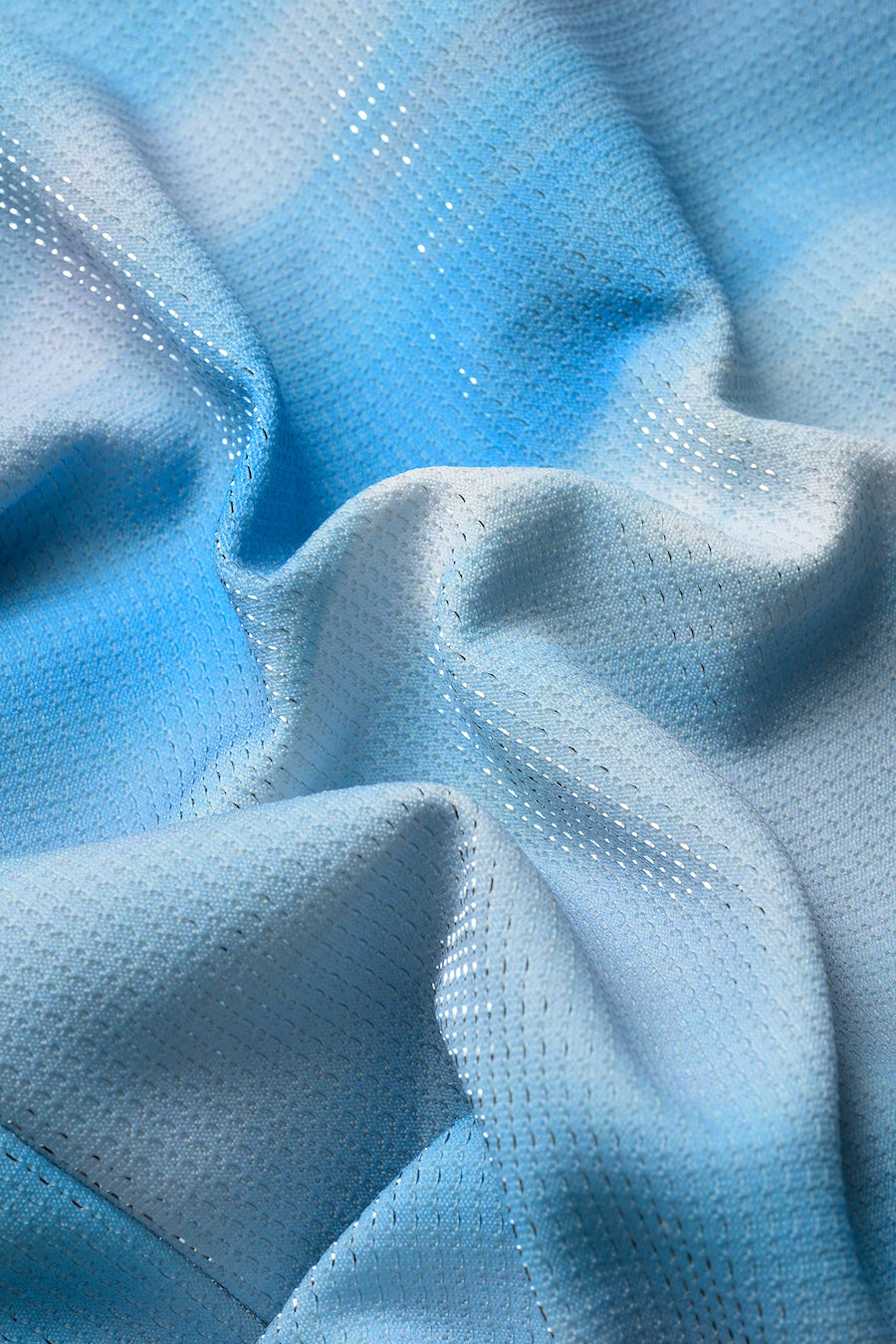 別注の厚みを持たせたラメ糸をポリエステルと編み込み、ラメ糸を立たせることで糸に角度が生まれ光の当たり方によって輝き方が変わるこのテキスタイルは群馬県桐生市にて製作。プリントモチーフはデザイナー関口のライフワークでもある手づけのビーズ刺繍のテキスタイルに偶然光が反射し柄として浮かび上がったことから着想を得てグラフィックとして採用。
