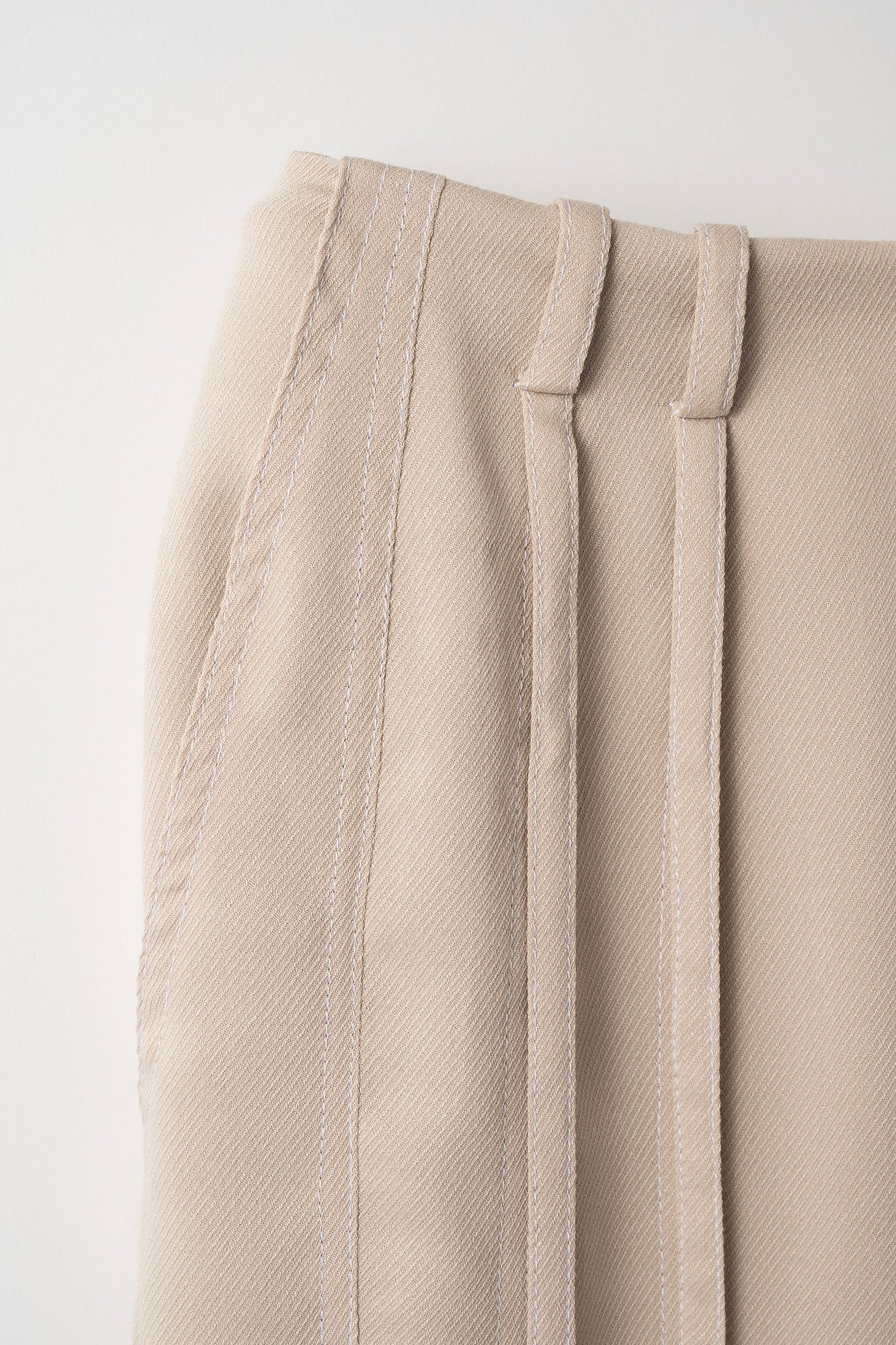 配色のステッチと長く垂れたベルトループがデザインのアクセントに。