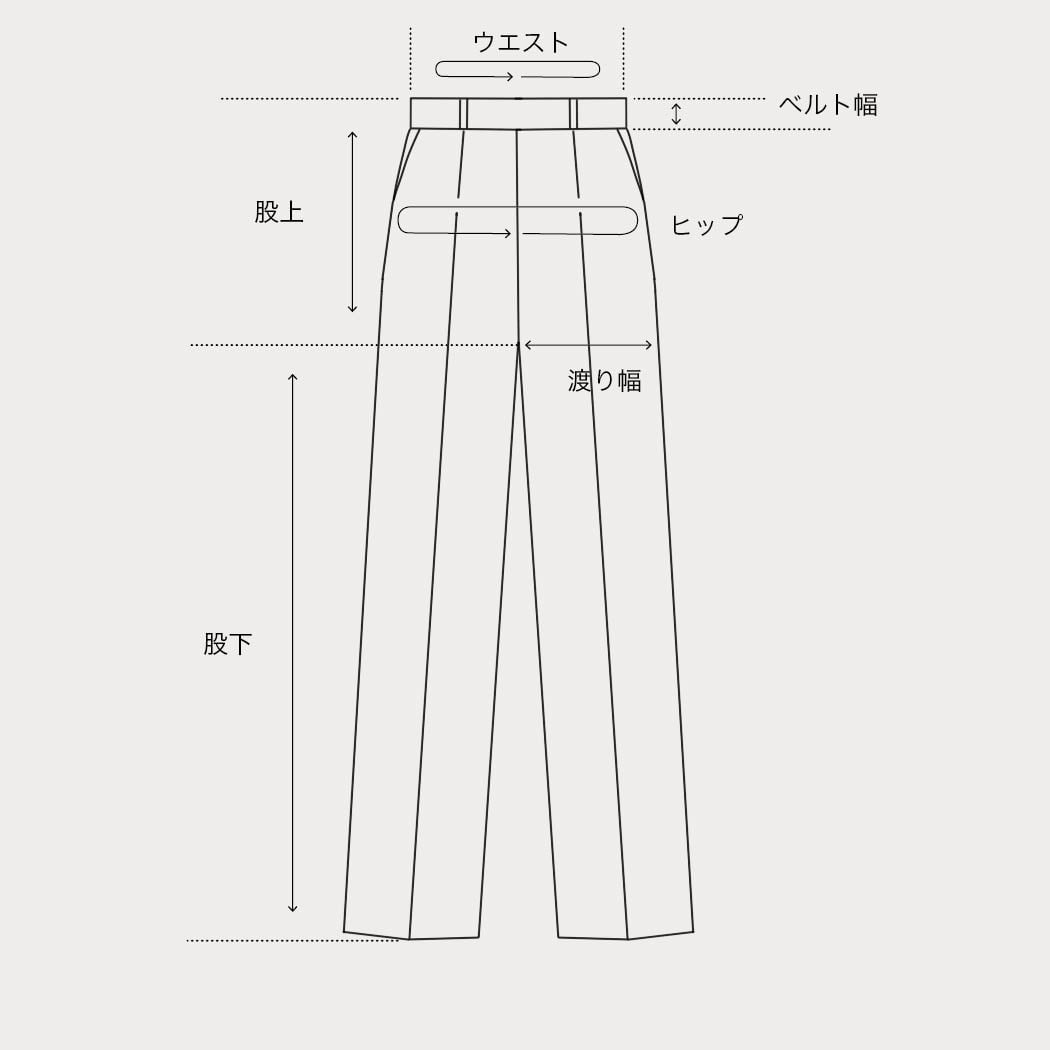 | ウエスト | ヒップ | 股上 | 股下 | 渡り幅 | ベルト幅 | |