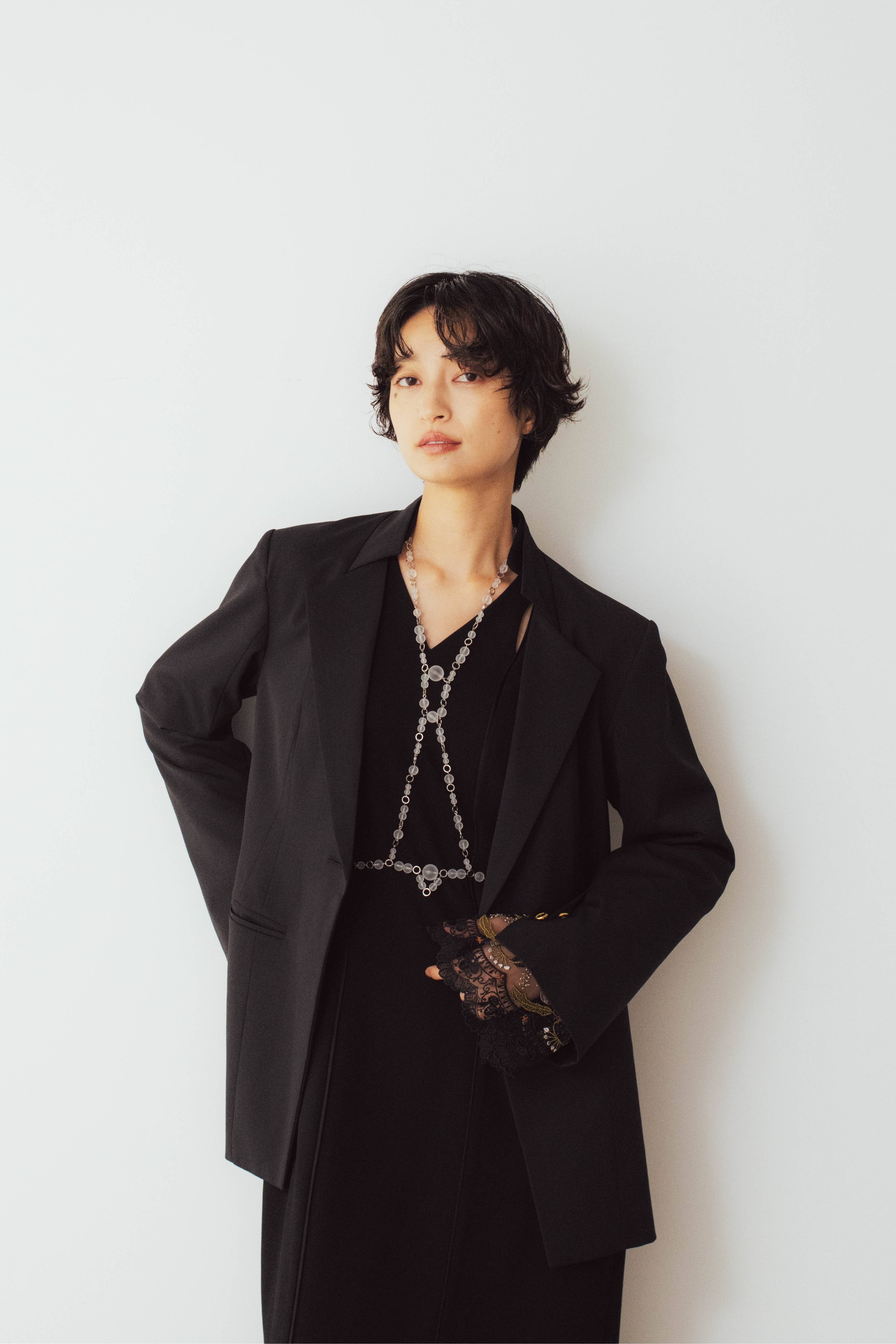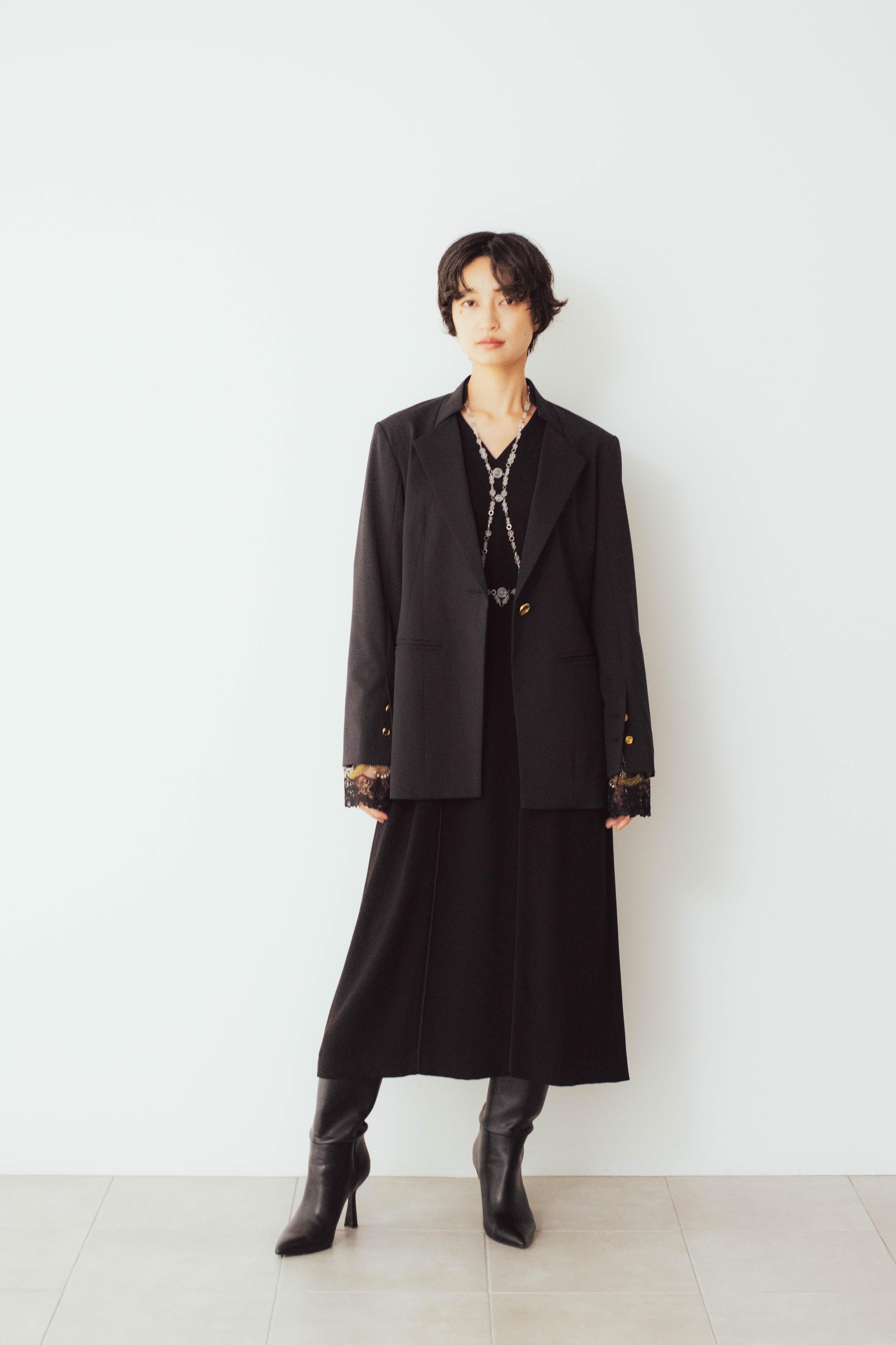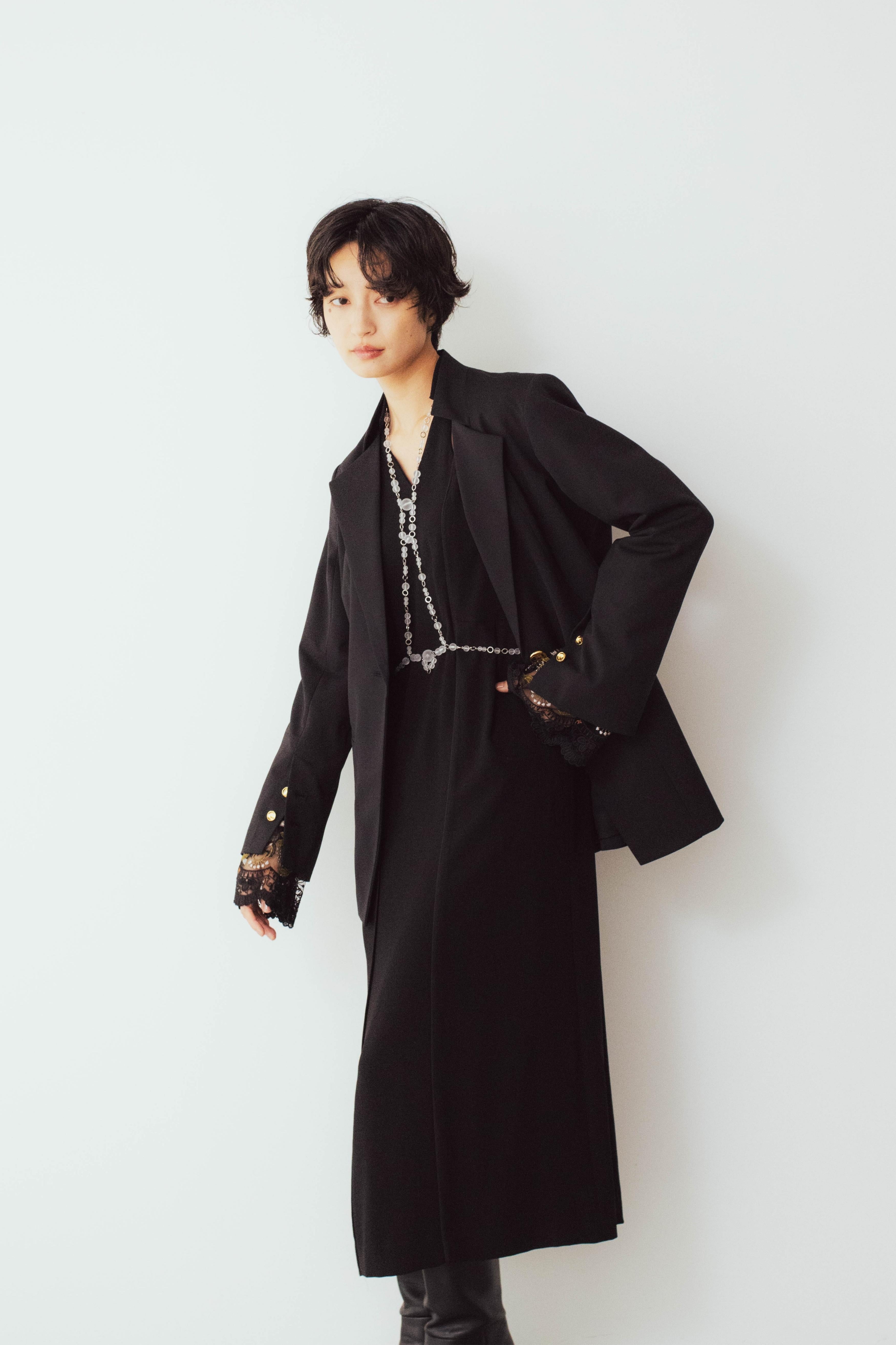 ドレスのシルエットは全体的に穏やかな佇まいのストレートシルエットに仕上げた。土台生地には発色に優れたアセテート混の素材を使用。花びらの形のようにカッティングされた変形の衿元はアクセサリーとも合わせやすいデザインに。