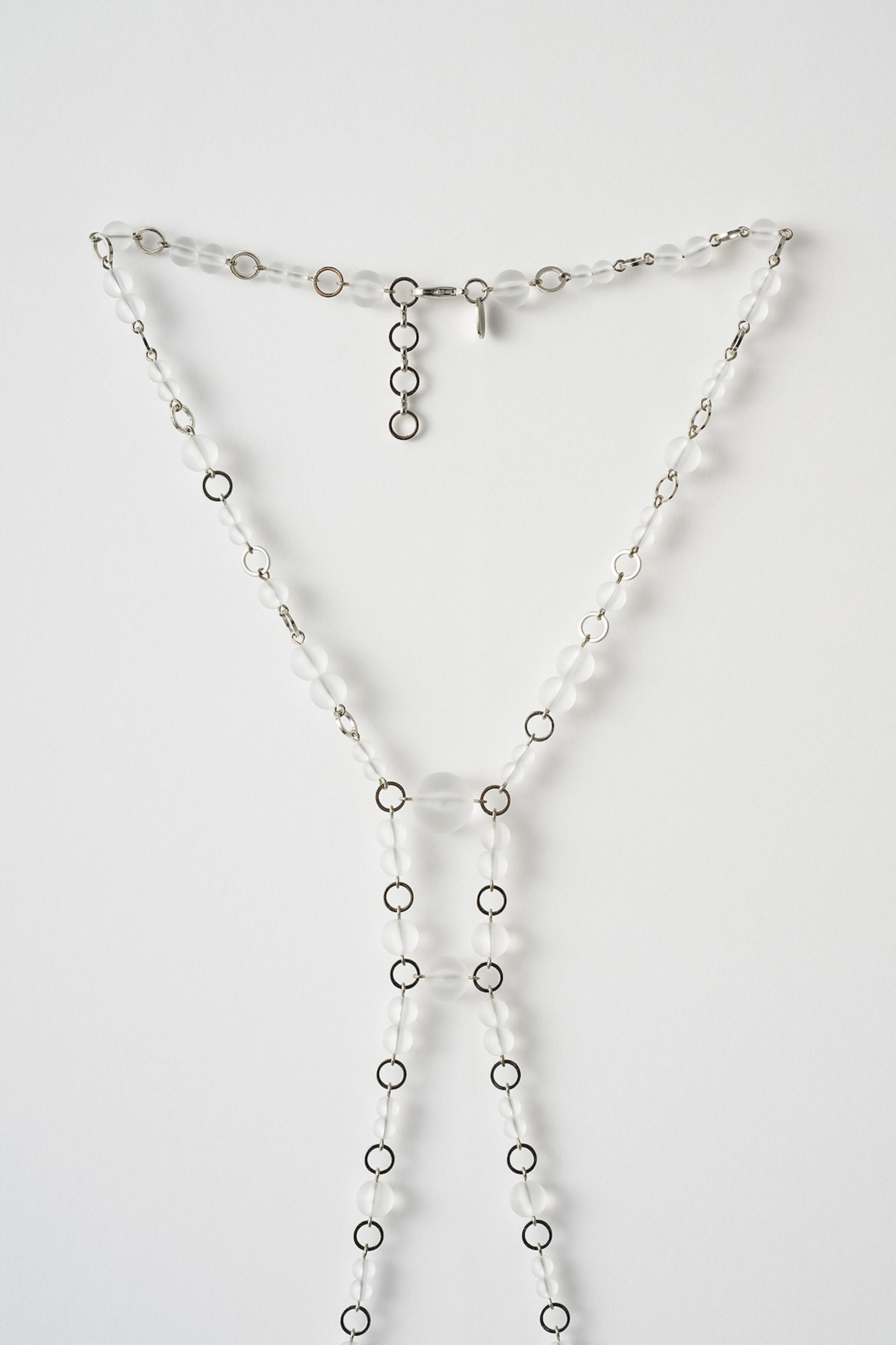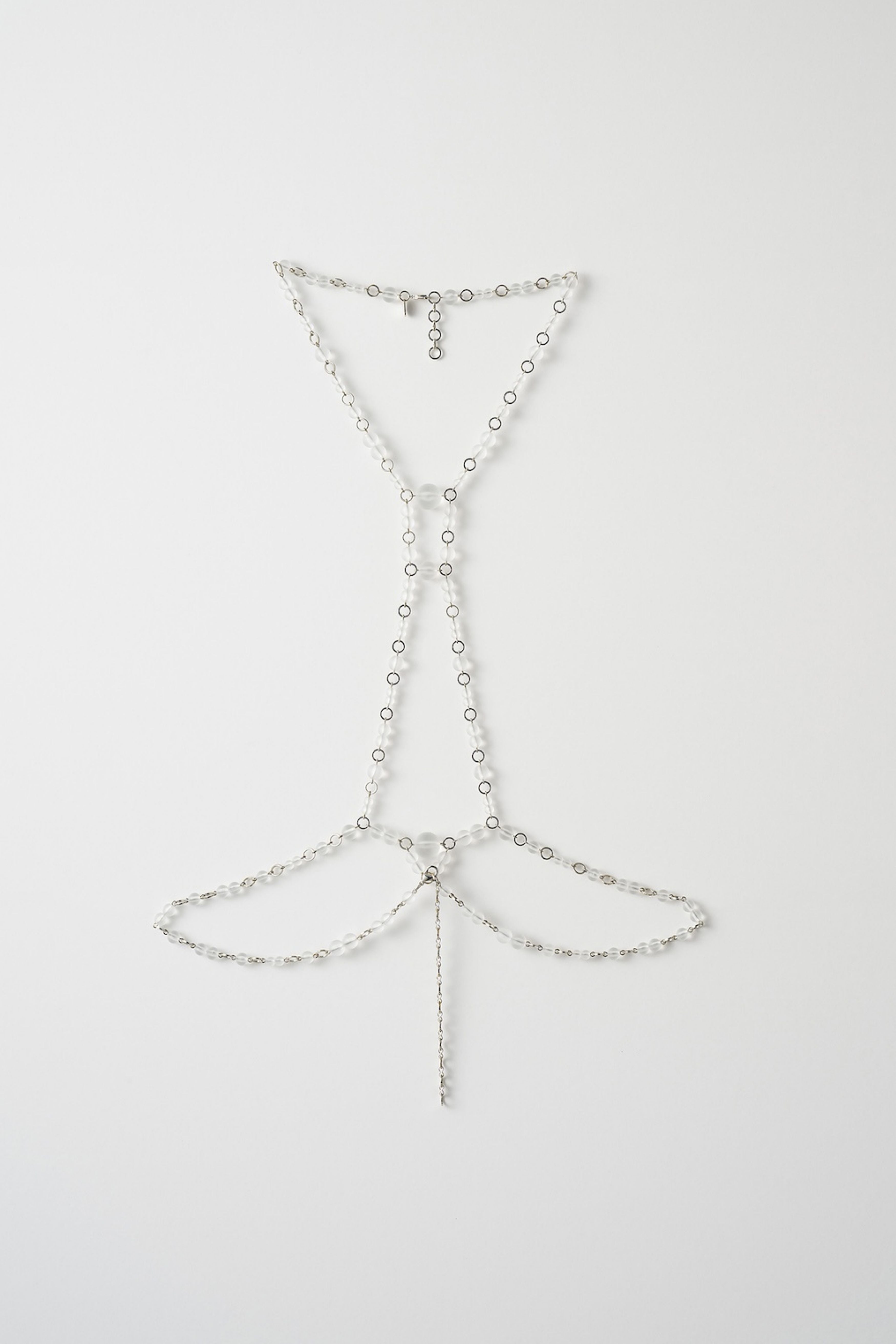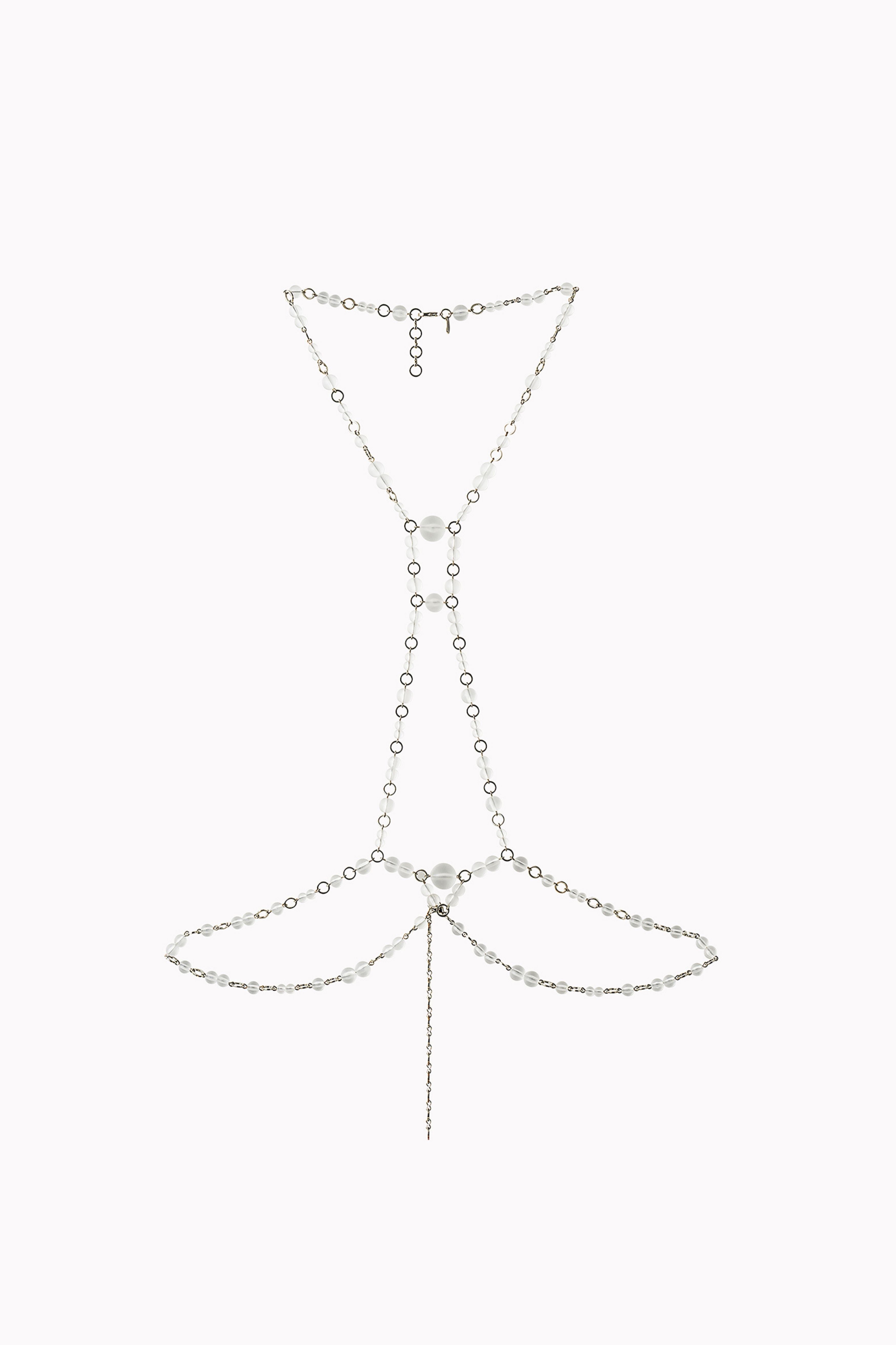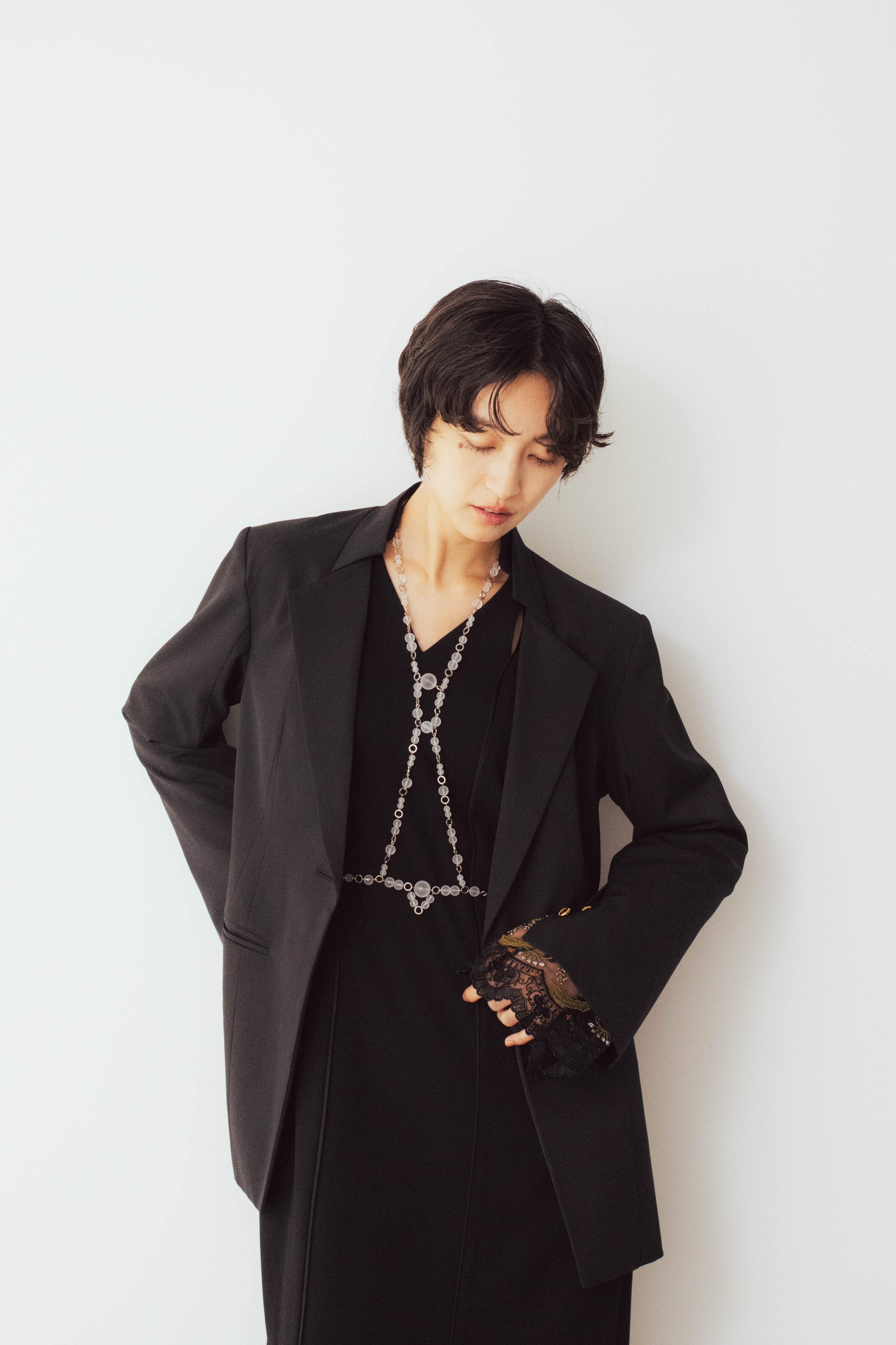 国産の刺繍レースを用いたまるで蕾のようなフォルムのスリーブが特徴的なドレスと、植物の種に見立てた球体のパーツに、艶消しの加工を施したボディジュエリーのハーネスのセット。