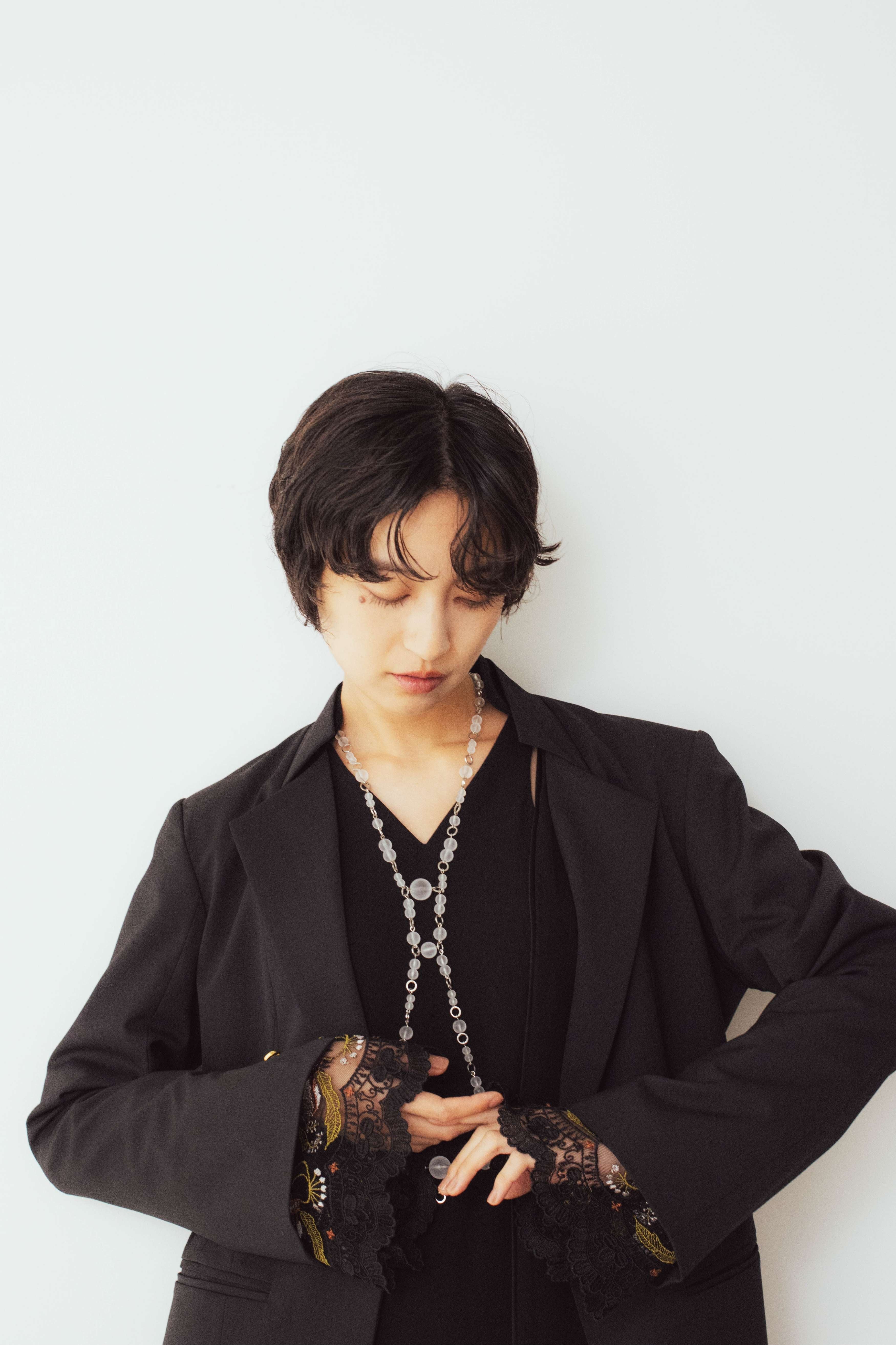 モノトーンのカラーリングの中にアクセントになるクリアカラーの装飾美は、シャープな印象のドレスに艶やかな質感を与える。