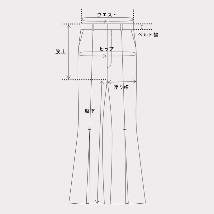 | ウエスト | ヒップ | 股上 | 股下 | わたり幅 | ベルト幅 | |
