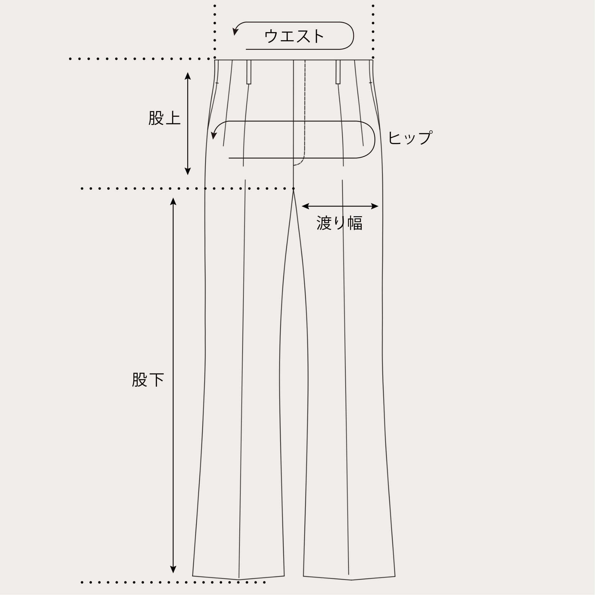 | ウエスト | ヒップ | 股上 | 股下 | 渡り幅 | |